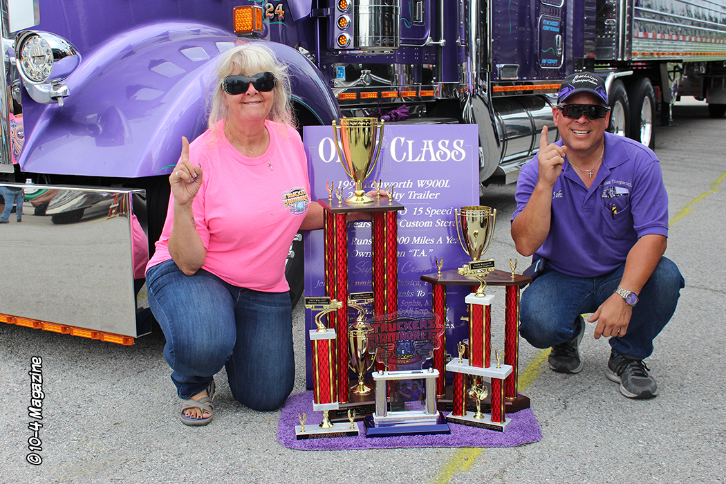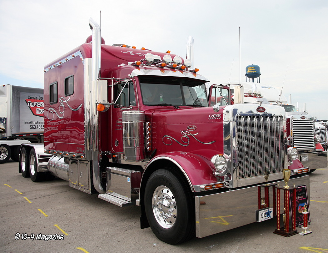 Another first timer to Walcott was Eva Knelson, who was doing double duty, having her pink KW truck “Ken Worth” in the show and having a booth selling t-shirts (she donates the proceeds to three causes). Eva was our Trucker Talk feature in February 2019 (Pretty in Pink). It takes a real man to wear pink, and I have to say Eva had “Ken” on the Best Dressed List when she won her class. Trembling and crying when she walked up to get that well-deserved 1st place trophy, Eva was sporting her favorite Breast Cancer Pink Nine West heels. Running Canada and the western U.S. in the winter, it’s a big job to clean a truck like hers up to show after hauling in those conditions, but she did it.