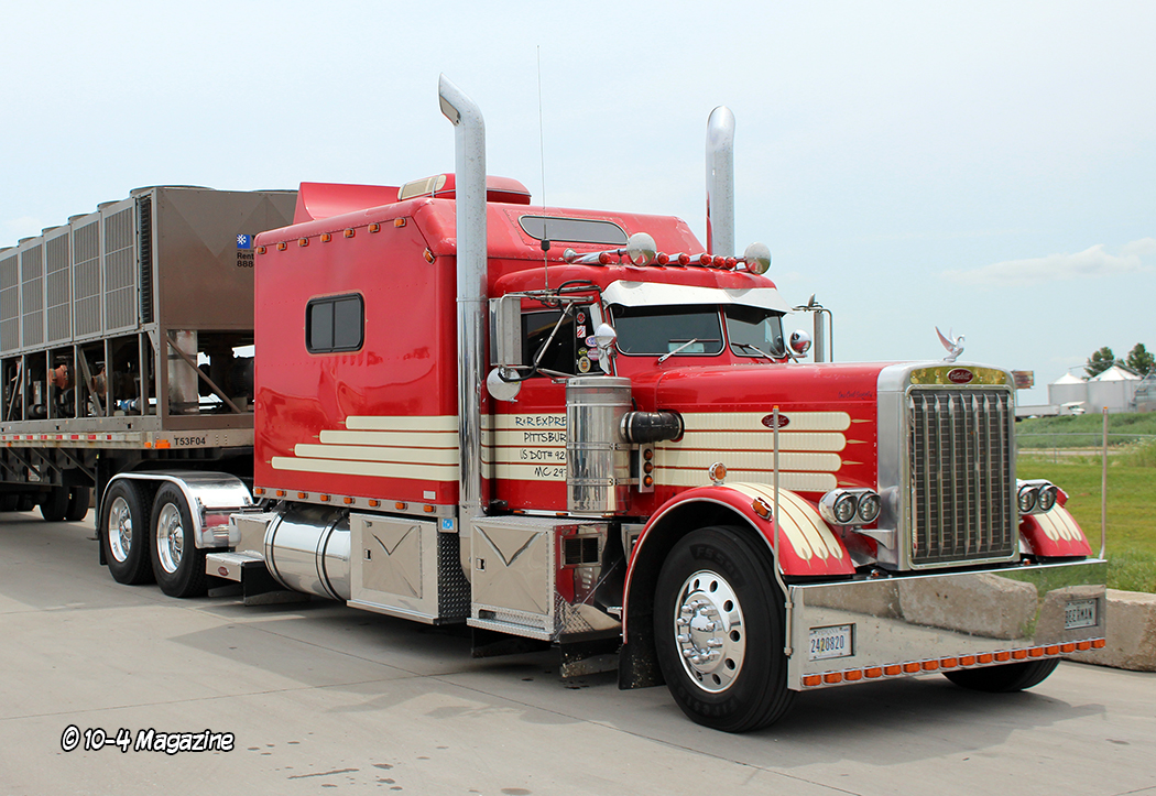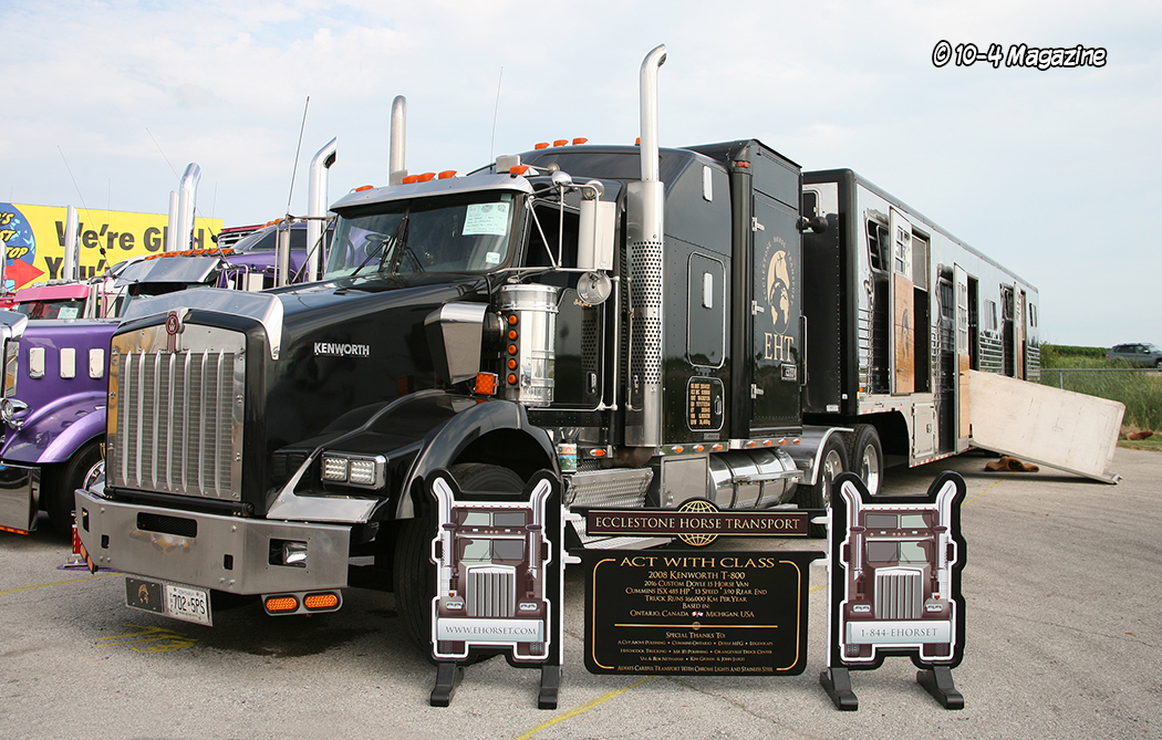 Su Schmerheim and her trucking cat Jake (he even has his name on the door, his own brag board and Facebook page) came to Walcott for the first time. I can never remember a horse trailer being at this show and sitting in the first spot, but here it was. Su opened her custom 15-horse trailer and had an awesome display of “everything horse” inside, while Jake (the cat) was in his playpen with a liner on the bottom that becomes cool when he sits or lays on it. Even in the heat, Su put on her entire riding outfit for judging. Chatting with people, Su answered all their questions and was a great ambassador for the horse and trucking industry. Her deliveries go to farms, and she can get in some pretty dirty spots, but she worked hard to clean her black and gold 2008 Kenworth T-800 “Princess” up and make her shine.