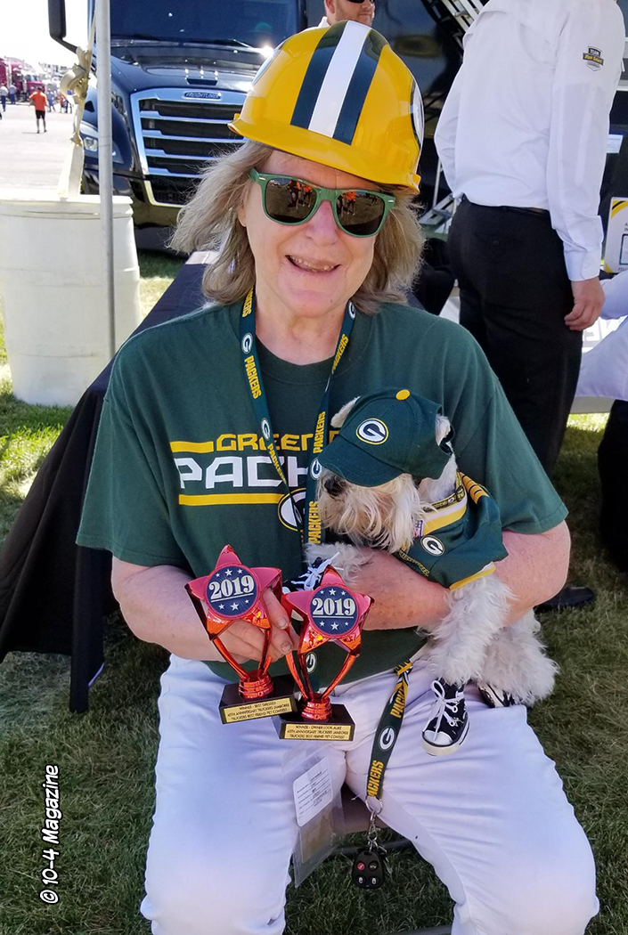 Not her first time there, our friend Cathy Sherman was at Walcott with her beautiful blue Mack Anthem. Cathy worked hard to get her rig cleaned up, and really enjoyed getting to visit with old friends and participating in the pet contest with her miniature schnauzer LJ (LJ took home the trophy for Best Dressed Trucker Pet and, together, Cathy and LJ won the Pet Look Alike award). If you know Cathy, it was no surprise that they won wearing Green Bay Packer garb. Cathy’s hard work paid off when she took home 3rd place in her class.