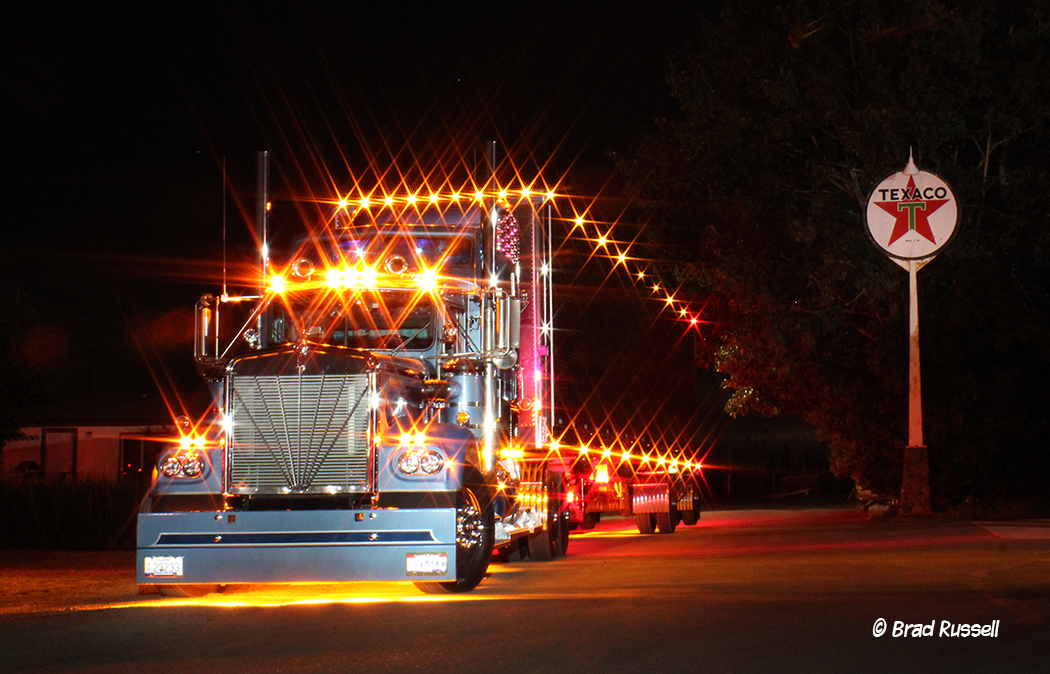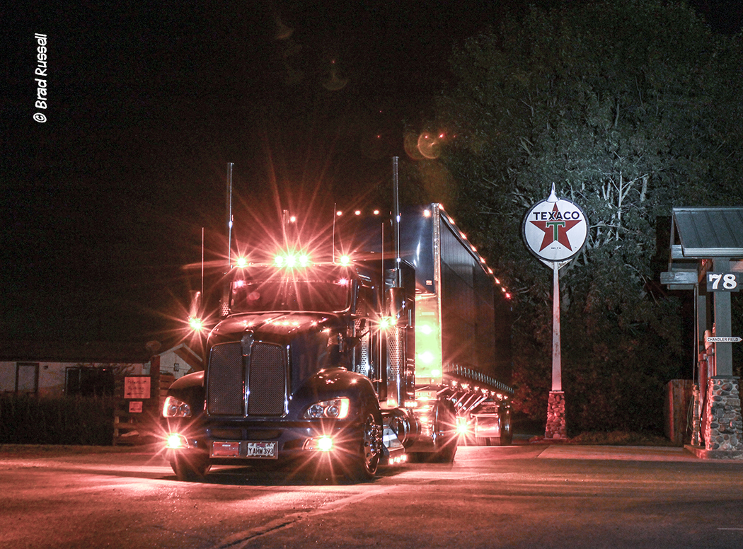 Driver Brad Russell of Tulare, CA recently posted a picture that reminded me so much of Bette, I had to include it. Bette loved to shoot night shots with her star filter, which gave the lights an exaggerated shine. Although Brad did not use a star filter, he did capture a cool night shot of Chad Iosco’s Kenworth in front of an old Texaco sign. Of course, every great picture has a story behind taking it. Since he had left his camera at home, Brad borrowed one from a friend, Alan Koch. They put a 2×4 across some cones, and then Brad put his wallet under the lens for a little elevation. Manipulating his settings, instead of using the star filter, gave Brad the same results Bette would have had! It was truck pics that kept Brad trucking when he was ready to quit after his dad passed away in 2007. Getting his start in a 1-ton tow truck, Brad went on to operate cement mixers and pulled walking floor trailers. But, for the past 20 years, he has made a career out of hauling automobiles.