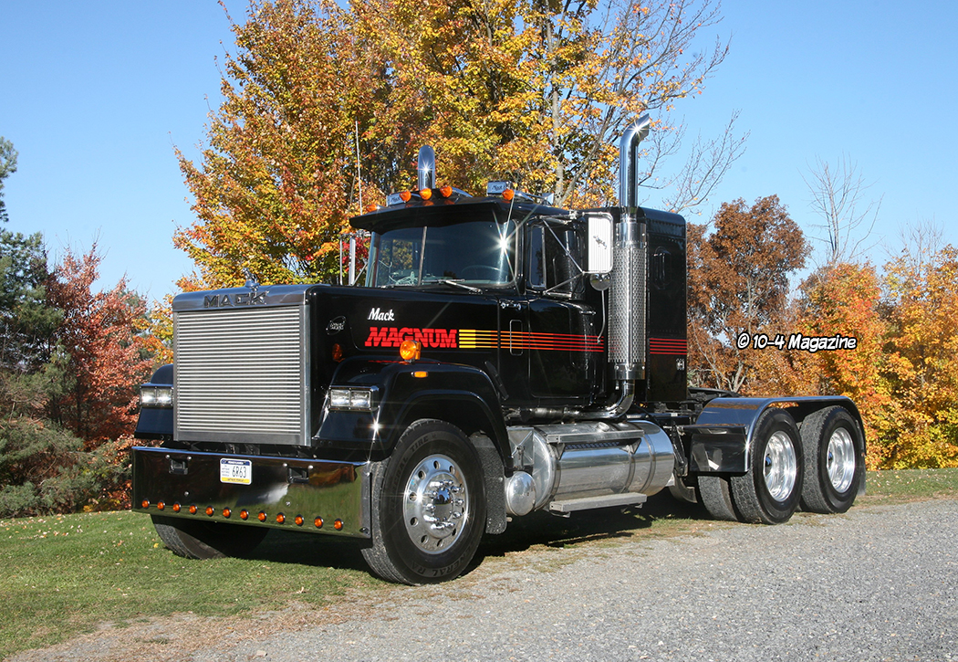 A total of 186 Magnum edition Super-Liners and 64 Ultra-Liners were built.  These trucks were easy to identify as they were all black with “Magnum” in bold red lettering on the side of the hood (and cab of the Ultra-Liner) with trailing thin red stripes after the Magnum name.  Magnum trucks were special, and  they came with a special red Mack interior package, as well as other cool details, such as chrome plated brake chambers, that set it apart from other trucks.  Mack offered the Magnum Super-Liner in two sleeper configurations – a 36” and a 60” flat top – built by Able-Body.  Mack also offered the Magnum edition trucks in three horsepower ratings that included 400-hp, 450-hp, and 500-hp.