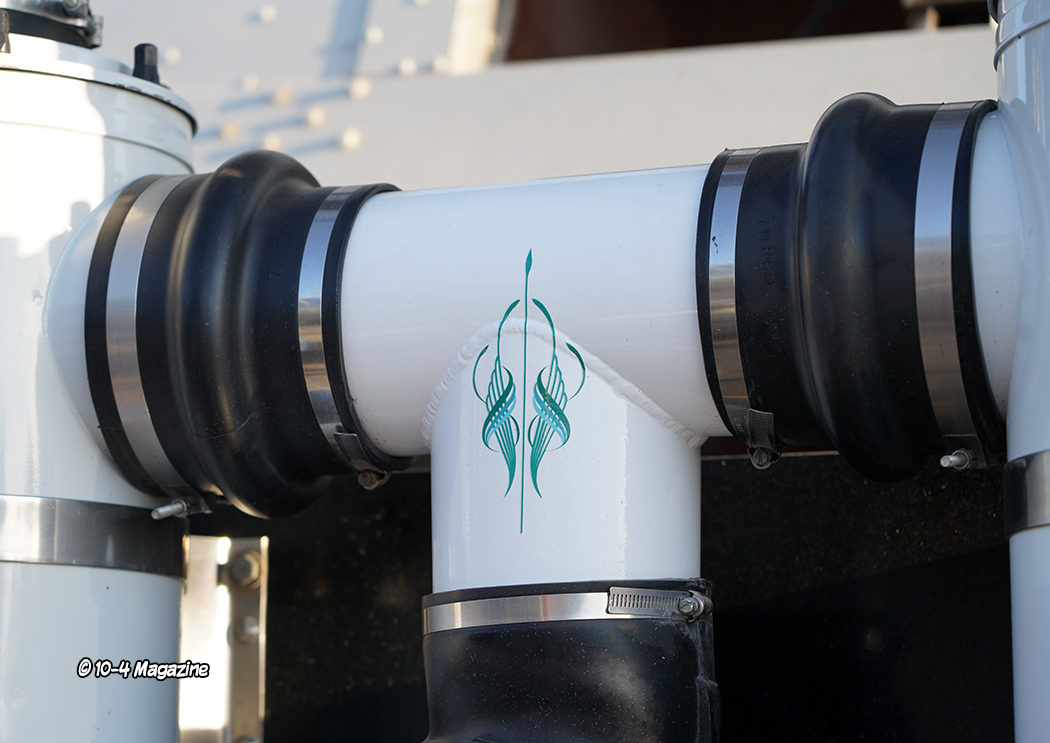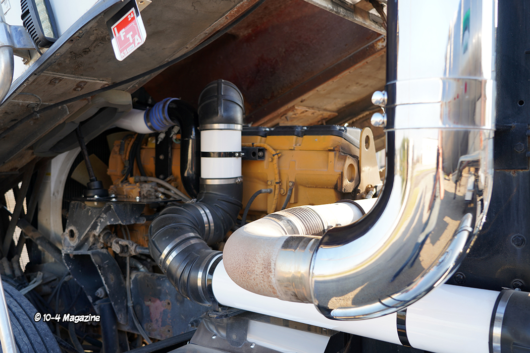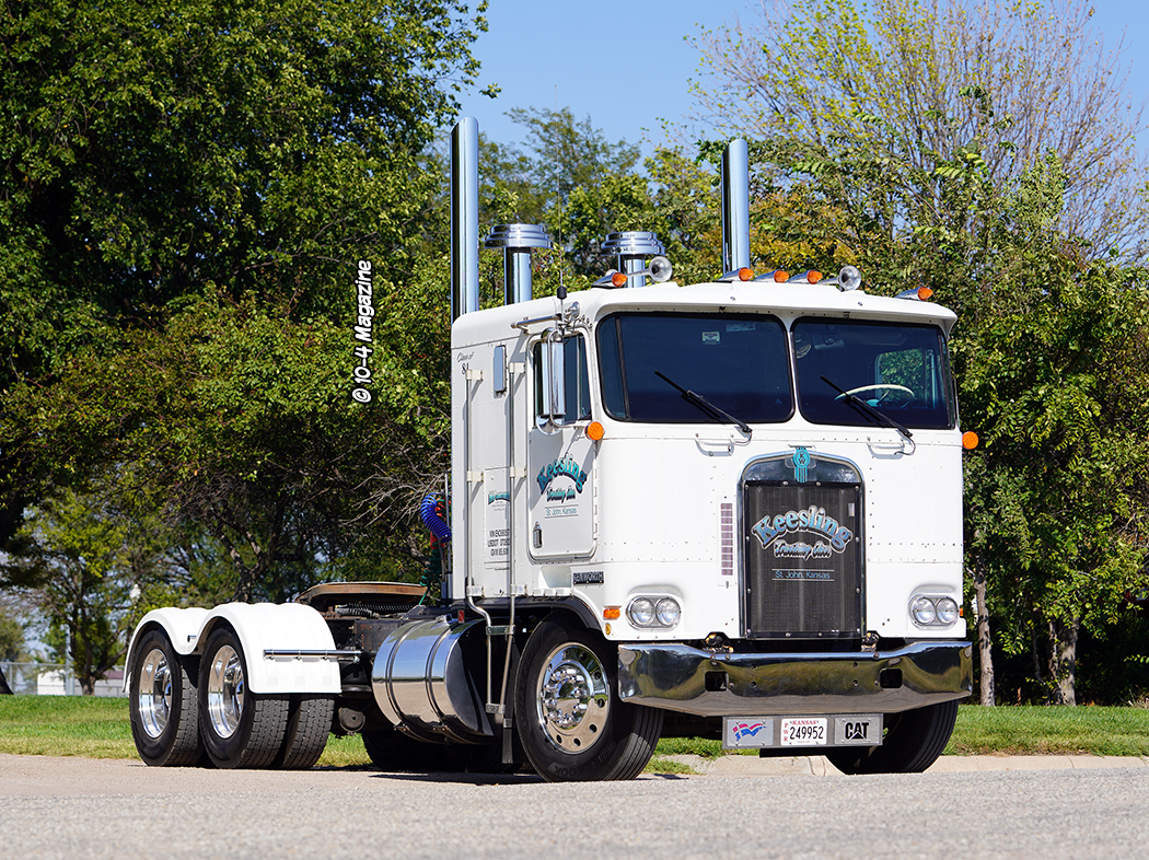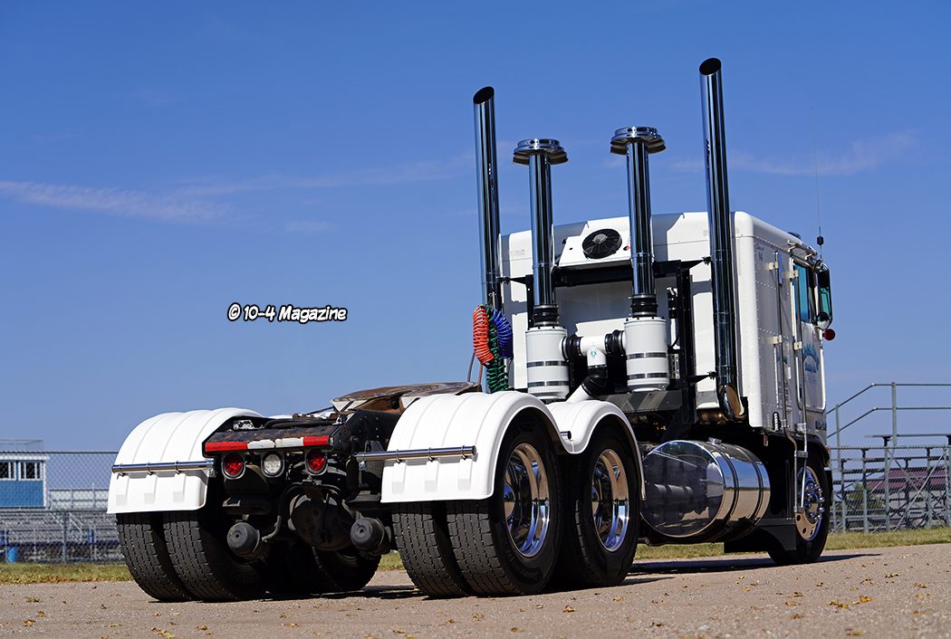 The truck is a 1984 Kenworth K100C. Originally purchased with a 855 Cummins Big Cam IV and a 13-speed RTO 14613 transmission, it now has a Caterpillar 1LW 3406E and a 13-speed RTLO 18913A, as well as 3.73 rears, and rides on a factory 245” wheelbase. The truck sports an aftermarket Goldwing bumper, 7-inch Lincoln Chrome exhaust and intake, and a factory visor. It was ordered brand-new as a straight truck with a box, which is why it has the factory 245” wheelbase. The pinstriping and vinyl on the truck was done by Mark’s Custom Signs in Great Bend, KS.