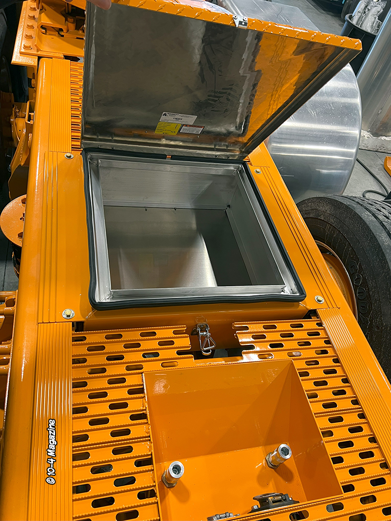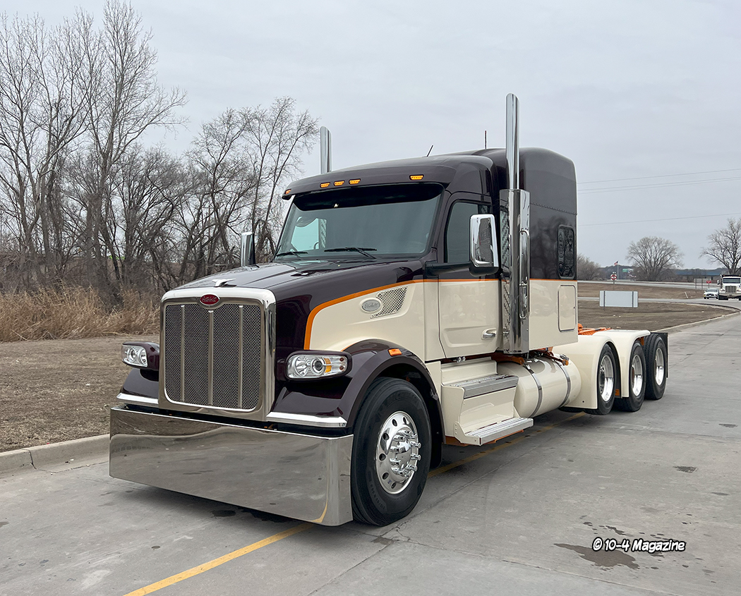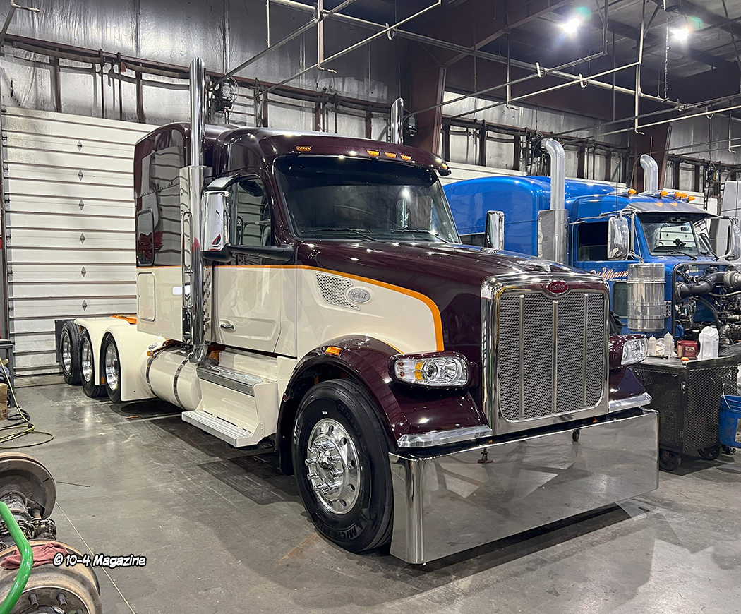 The new truck was ordered in a legendary black cherry with an orange frame that matches his other unit. The truck has a 565-hp X15 with 2,050 torque, an 18-speed, full locking diffs, Neway ADZ 46,000-lb. rears, and a 20,000-lb. lift axle. But, for a nice look, we opted for a 5” drop axle with 315 steer tires for the “big” but still cool look. When the truck showed up, Kenny worked on hiding the DEF tank for us under the cab. Once that was done, Jesus and Pat helped me layout the stripes, then Mike was given the task of dialing the rest of the items in.