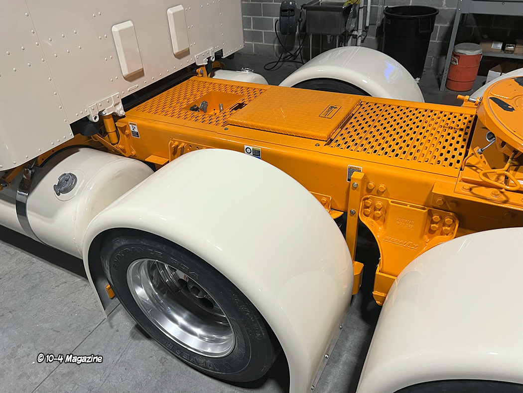 Our friend Jim Boeckman swapped our 120-gallon left tank for a matching 150-gallon fuel tank to help out. We got some aluminum Fisher fenders from our friend Steve Brown, which Cody was able to fabricate some brackets for from some of my old leftover parts (and a few new ones, as well). We added some Merritt deck plate pieces and an in-frame toolbox, as well. Our painter Jimmy sprayed the step boxes, fuel tanks, rear fenders, and all the brackets and frame parts. Right before he got here to pick it up, Armando decided he wanted the headlights painted black cherry for a final touch.
