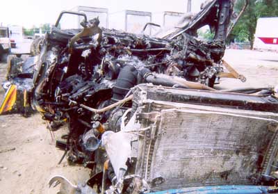 As we pulled into the towing yard, the cab driver commented on seeing the details of the wreck on the evening news. We could not believe what was before our eyes. When we were told that there was nothing left but the frame, that was a correct statement. The truck was a pile of metal frames - the frames of each seat, the mattress springs, the front axle and the rear ends. The trailer was basically burned away as well.