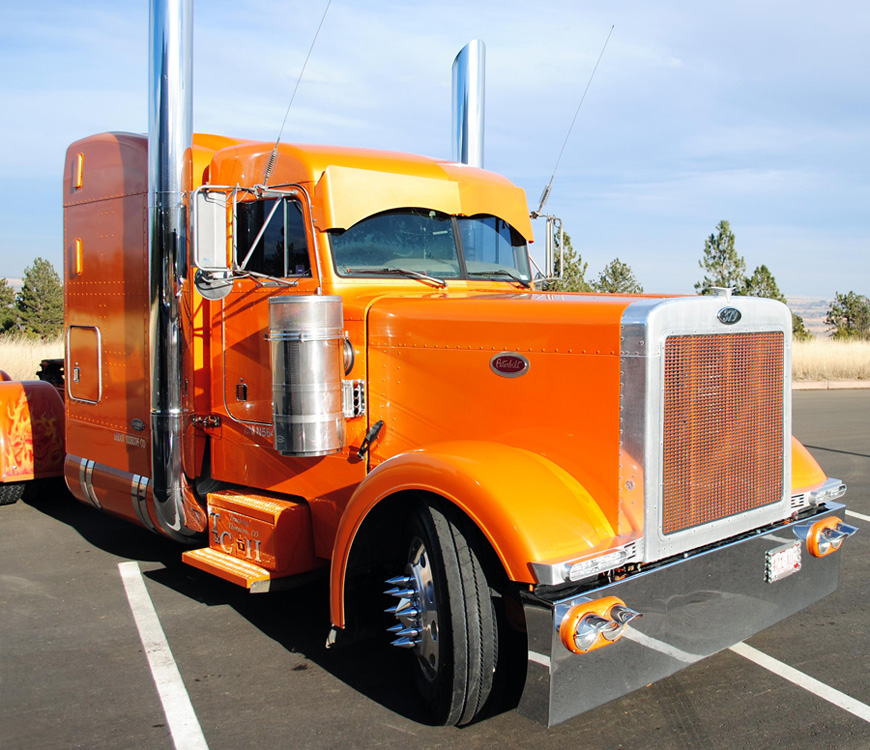 Ramon’s truck is no ordinary “dump” truck. When Ramon began building the truck, he didn’t want it to have a particularly subtle look, and it doesn’t. The bright orange truck, which began its life as a stock 2001 Peterbilt 379, features many impressive and over-the-top parts and work. The rig’s most noticeable modification is the bumper-mounted headlights. Set into a 20” American Eagle bumper, the 359-style double round headlights certainly give the truck an outlaw look. Moving back, the truck also features drop front fenders and a drop visor, similar to the one used on Outlaw Customs’ “Vigilante” rig. There is not a lot of chrome on this truck, but what there is, it is big – the shiny air cleaners are followed by 10” Dynaflex pipes that are nearly the same diameter! Other features of the truck include painted sleeper and cab extensions, as well as painted step boxes and fuel tanks.