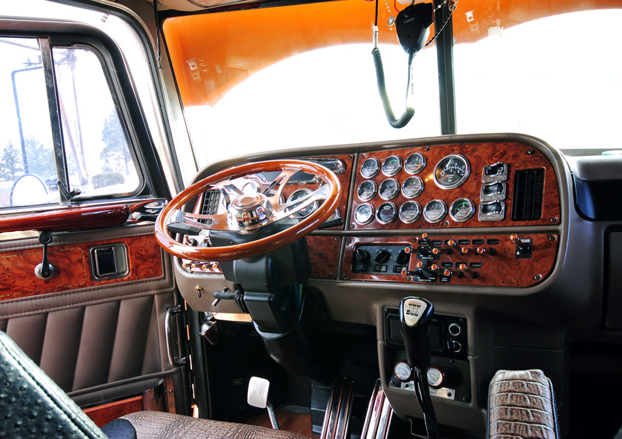 However, what is perhaps one of the most extreme changes to the truck is the sleeper. It, to many, probably just looks like another Peterbilt standup sleeper. But, on closer inspection, you’ll notice it is quite a bit shorter. Ramon and his son, Ramon Jr., chopped an entire 7” off the sleeper height, which now rises only slightly higher than the cab. The exterior of the truck was finished off in one last, loud note, when Ramon added double-hump rear fenders that were airbrushed with skeleton bandits toting smoking shotguns. All of the airbrush work was handled by close friend Pedro Gutierrez. At the tail end of the truck is a nice, polished rear light bar. Ramon’s truck, which is powered by a 550 horsepower Cat routed through an 18-speed transmission, sits on a 270” wheelbase. The interior of Ramon’s truck is no less understated than the exterior. Featuring copious amounts of wood, including a hardwood floor he and his son installed, the inside also features a full set of chrome gauges, a polished steering wheel and alligator-skin seats, too.