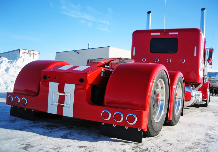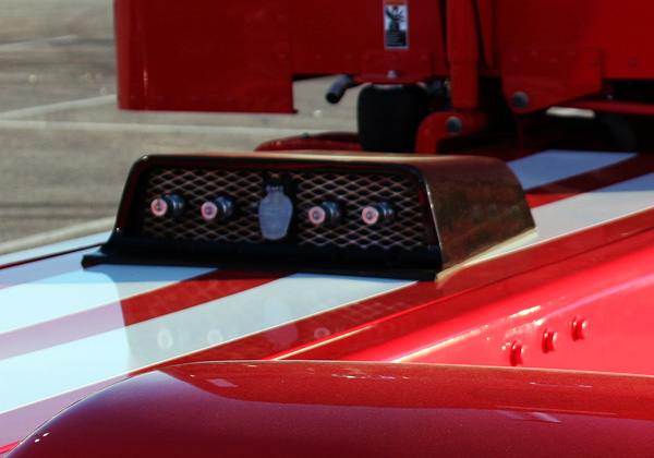 Clint did not do much to this truck, as Jade does most of their own work and customizing. He provided one of his signature visors, but that was it. The guys at Jade installed a set of their own rear fiberglass fenders (Shift Products), a smooth deck plate (painted red with two white stripes), a custom rear light bar, breather light panels from Shift, and a vintage 1970’s hood scoop, that was mounted on the deck plate and modified to house the airline connections. They also chopped the breather lids, changed the seats, and added a dump valve on the steer axle.