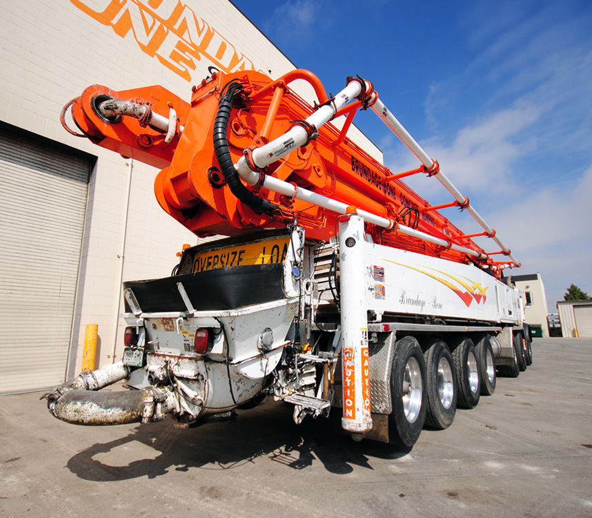 Due to their size, Brundage-Bone’s fleet has a wide array of pump sizes, with their smallest unit being a 17-meter Schwing and the largest currently in the fleet being a 63-meter Putzmeister. Those who have kept up with recent news may have seen or heard about the two massive pumps that were sent to Japan in the wake of the earthquake and Fukushima nuclear power plant failure crisis. Only three of these pumps, huge 70-meter units, have been manufactured in the United States, and they are a set-up legal only in California and Alabama. One of the two pumps sent to Japan was in the Brundage-Bone fleet until 2009, when it was sold due to the economy.