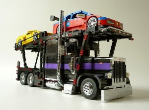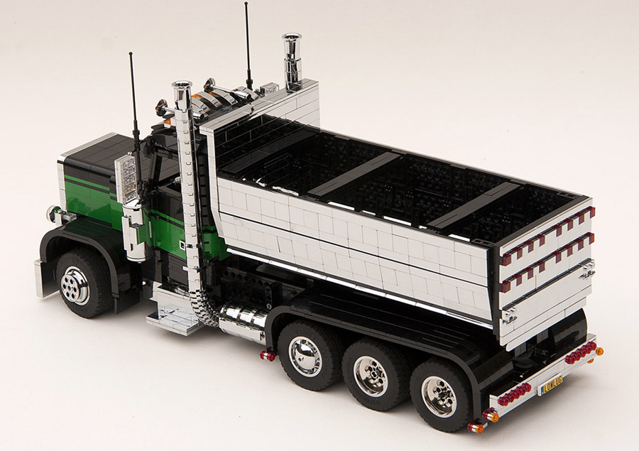 Building mostly Peterbilts in scale 1:13 and 1:16, a completed rig can easily weigh between 10 and 15 pounds and require thousands of bricks to construct. Some are even remote-controlled, with multiple engines for the drivetrain and steering.