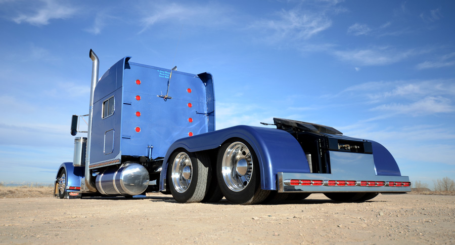 Other details on Chris’ slick Pete include a painted deck plate, flipped mirrors, oval-punched grille, shaved doors with poppers all the way around and painted tanks with polished straps and ends. The color is a factory color, Medium Metallic Blue as Chris calls it, but a relatively uncommon color to see on trucks painted at the factory. Chrome was kept to a relative minimum with only the breathers, bumpers (front and rear), steps, stacks and a few other small pieces being polished out. Chris’ truck has a simple, clean, ground-scraping look to it that is very appealing.