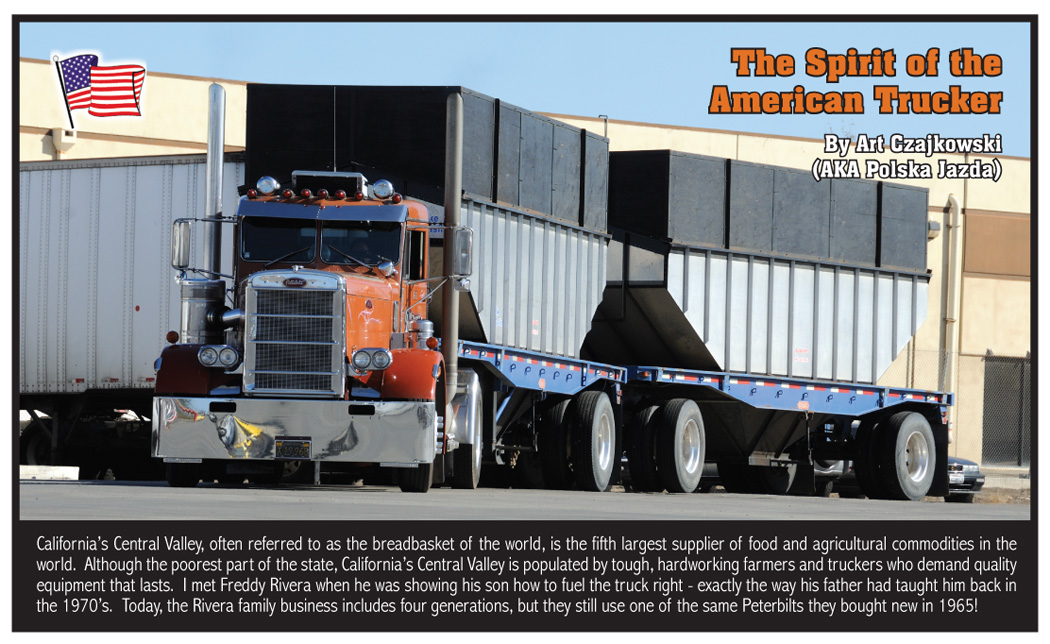 California’s Central Valley, often referred to as the breadbasket of the world, is the fifth largest supplier of food and agricultural commodities in the world. Although the poorest part of the state, California’s Central Valley is populated by tough, hardworking farmers and truckers who demand quality equipment that lasts. I met Freddy Rivera when he was showing his son how to fuel the truck right – exactly the way his father had taught him back in the 1970’s. Today, the Rivera family business includes four generations, but they still use one of the same Peterbilts they bought new in 1965!