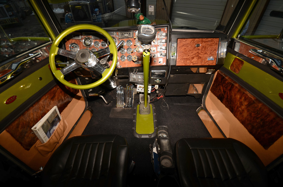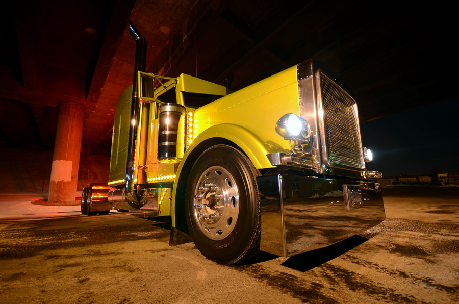 Torn down to the cab, hood, rails and running gear, the truck was reworked inside and out. Painted a custom-mixed color called Lime Gold, the truck was extended from a 265-inch wheelbase to 295 inches. The truck also features a 2006 Unibilt stand-up sleeper that has been chopped 5.5 inches and has a completely reworked opening to fit the older cab. All of the doors, including the custom sleeper door on the passenger side (a non-OEM feature), have been shaved, rigged with door poppers and suicided. With the nose lowered four inches, the truck has a 20-inch tapered American Eagle bumper, drop front fenders, a billet one-piece grille with stainless surround, and double-round 359 headlights on Double JJ brackets. The truck also has a painted bowtie visor, thirteen “penny light” marker lights, custom-fabricated mirror brackets, 8.5-inch cab and sleeper drop panels and over 130 lights total on the truck. “Ya Wanna…” also features plenty of polished stainless including the step/battery boxes, the breathers and deep-drop half-fenders over the drives. Surprisingly, with so much done to the exterior the truck, it still has a very clean, if not subtle, look to it.