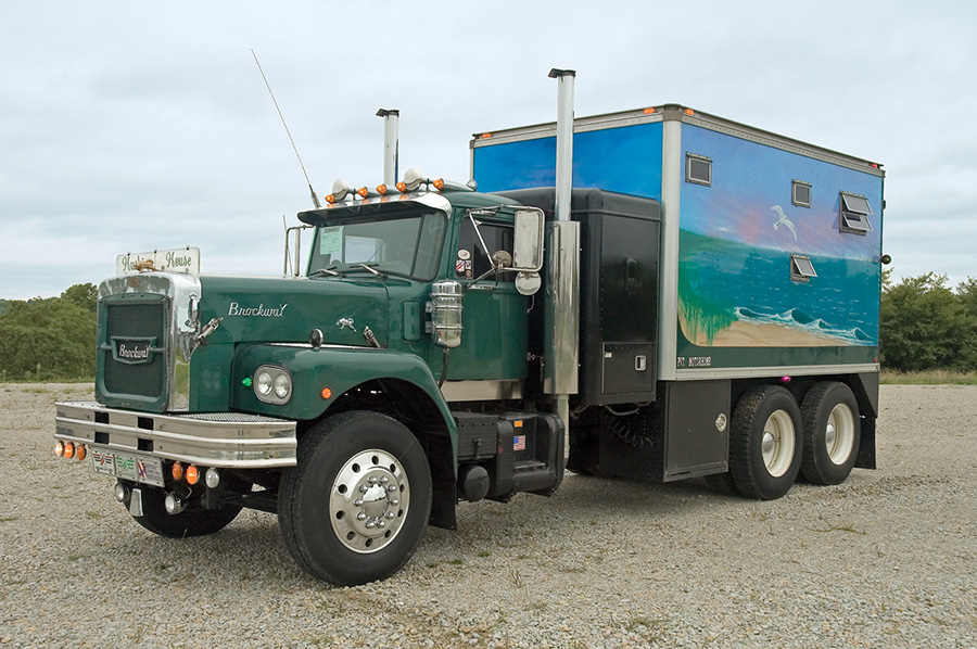 If you pass this truck driving along the road one day, chances are good you’ll notice (and remember) this 1969 Brockway 361. With beautiful beach and snow scenes painted on the dry box, the “Husky House” is a full-fledged motorhome with air-ride suspension and is a pleasure to drive for owner David Hemelright of Lenoir City, Tennessee. In 1989, the original transmission and power plant were replaced with a new Series III Big Cam Cummins with 400 horsepower and a five-speed overdrive transmission. An International front axle and a heavy-duty radiator were added, raising the cab four inches above its original position on the frame. The dry box that replaced the original fifth wheel sports a hand-painted mural created by Chuck Gamber (A.K.A. “Jack of Arts”) of Ellicott City, MD. Beginning on the driver’s side, the artwork shows an enticing beach scene that morphs to a snow scene on the passenger side with Husky dogs pulling a sled. In 2004, a Volvo air-ride suspension with 3:73 gears replaced the single-drive axle with air tug. Add in two bunks, a cook stove and a chemical toilet, plus a Western Star sleeper to improve the visual effect, and you have a rolling home that has traveled to many shows around the Northeast. For more “weird and wonderful old time trucks,” be sure to visit their website at www.oldtimetrucks.org.