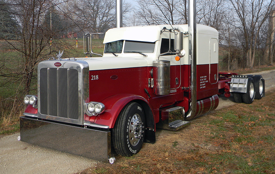 Clint ordered the new truck with no engine, transmission, or rear-ends. Featuring a split paint job with white on top and burgundy on the bottom (and frame), the truck had nothing fancy at all on it when it was delivered. After the guys in the Service Department (Charlie, Andy and Kipp) tore down the KW and completed the heart and soul transplant of the Cat 550 and 18-speed transmission into the Peterbilt, Shawn & Penny had the Body Shop do a few add-ons.