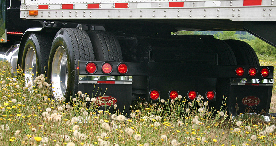 The truck originally had five old-school glass clearance lights, but one day the center light burned out. Leon liked the way it looked, so he just removed the center light from the center cluster, which left four, evenly-spaced cab lights, which he painted black. He also added four glass lights in front of the breathers on each side to match the four cab lights up on the roof. The final touch was removing the stock Peterbilt emblem on the front of the truck and replacing it with a small, black, metal Transformer’s “Autobots” emblem (Leon is one of the good guys – no “Decepticon” here).