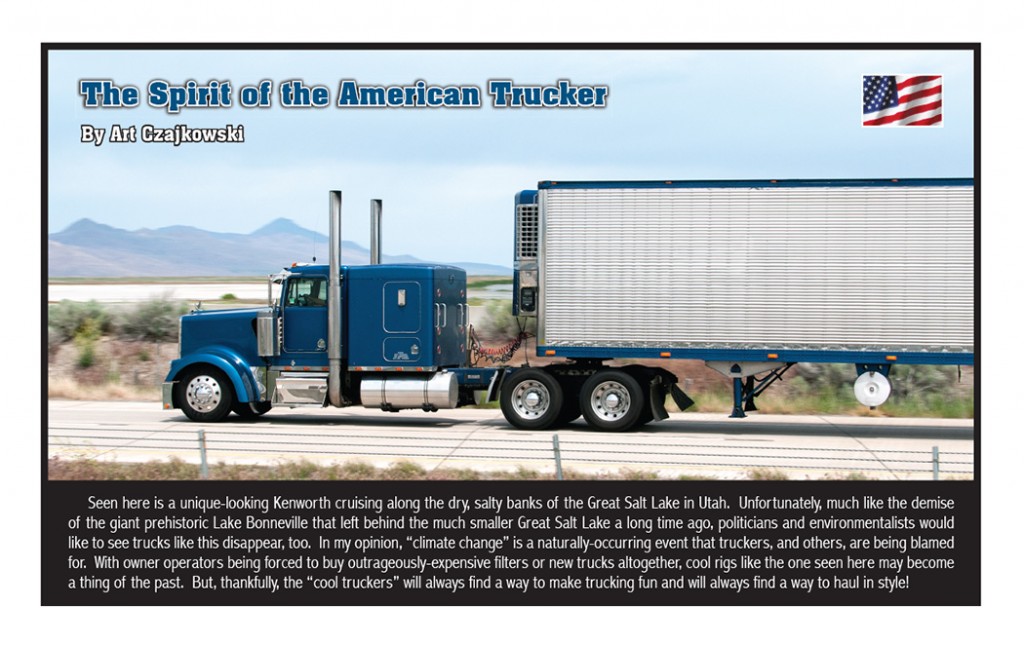 Seen here is a unique-looking Kenworth cruising along the dry, salty banks of the Great Salt Lake in Utah. Unfortunately, much like the demise of the giant prehistoric Lake Bonneville that left behind the much smaller Great Salt Lake a long time ago, politicians and environmentalists would like to see trucks like this disappear, too. In my opinion, “climate change” is a naturally-occurring event that truckers, and others, are being blamed for. With owner operators being forced to buy outrageously-expensive filters or new trucks altogether, cool rigs like the one seen here may become a thing of the past. But, thankfully, the “cool truckers” will always find a way to make trucking fun and will always find a way to haul in style!
