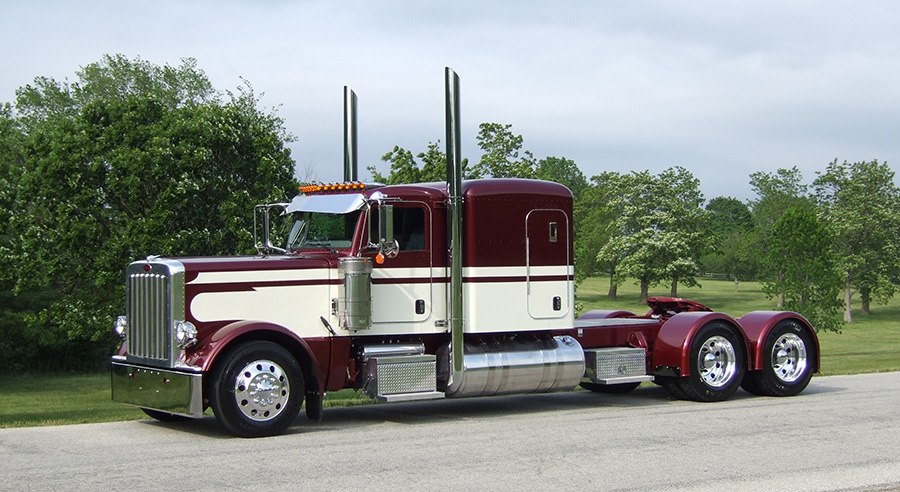Tim bought a slick 2005 flattop Peterbilt in 2008 and ran that until he bought his very first new truck from Clint – the 389 with a 63” flattop you see here. Featuring a factory Seminole paint scheme done in maroon and cream, this rig looks like a timeless classic. Powered by a 625 Cat hooked to an 18-speed transmission, the truck features a car-hauler front axle, 13 cab lights, “Outlaw” headlights, extra grill bars, trimmed WTI rear fenders, one of Clint’s visors, a smooth deck plate, and plenty of stainless and lights.