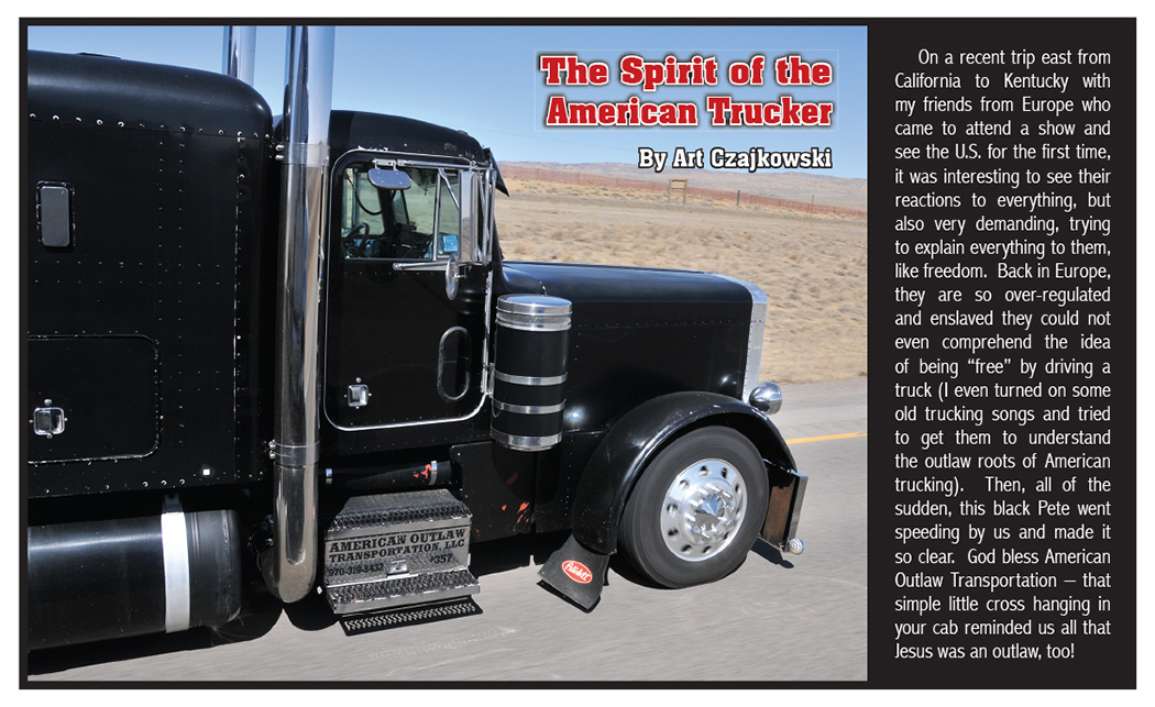 On a recent trip east from California to Kentucky with my friends from Europe who came to attend a show and see the U.S. for the first time, it was interesting to see their reactions to everything, but also very demanding, trying to explain everything to them, like freedom.  Back in Europe, they are so over-regulated and enslaved they could not even comprehend the idea of being “free” by driving a truck (I even turned on some old trucking songs and tried to get them to understand the outlaw roots of American trucking).  Then, all of the sudden, this black Pete went speeding by us and made it so clear.  God bless American Outlaw Transportation – that simple little cross hanging in your cab reminded us all that Jesus was an outlaw, too!