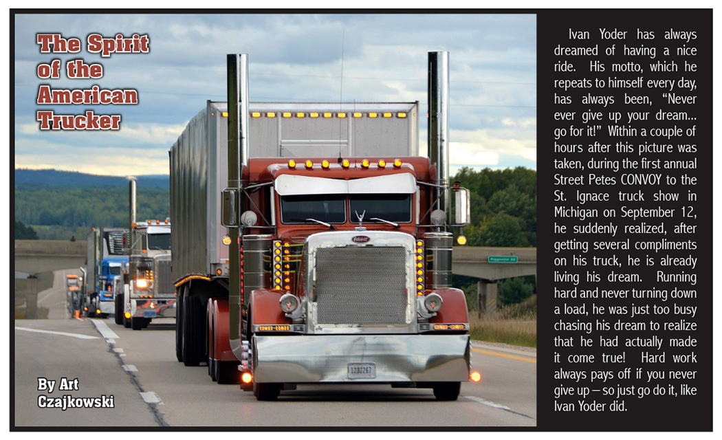 Ivan Yoder has always dreamed of having a nice ride. His motto, which he repeats to himself every day, has always been, “Never ever give up your dream… go for it!” Within a couple of hours after this picture was taken, during the first annual Street Petes CONVOY to the St. Ignace truck show in Michigan on September 12, he suddenly realized, after getting several compliments on his truck, he is already living his dream. Running hard and never turning down a load, he was just too busy chasing his dream to realize that he had actually made it come true! Hard work always pays off if you never give up – so just go do it, like Ivan Yoder did.