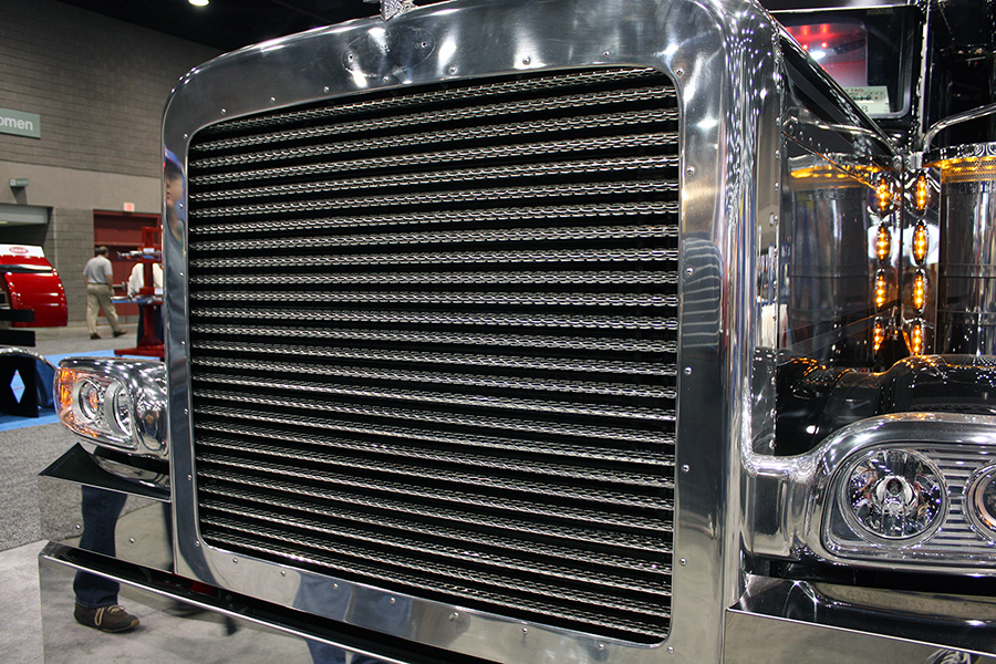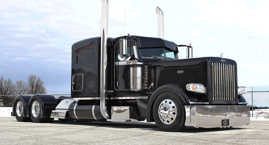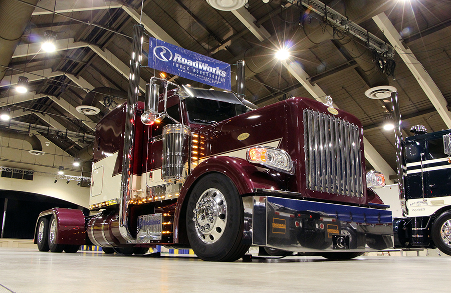 As part of their extensive product development and marketing program, RoadWorks builds a cool “show truck” featuring their latest products each and every year – they have been doing this for the past eleven years. This truck, which they drive to and from each show, is always a sweet ride. For the last eight years, these trucks have been spec’d by our friend Clint Moore at Kansas City Peterbilt. Each year, Clint orders the new truck as well as selling the previous year’s rig. After Clint and his team take delivery of the truck they do any needed paint work, hang the Fibertech fenders, install a set of Lincoln Chrome stacks and elbows, and swap the factory seats with Seats Inc. Legacy LO series leather seats. Once Clint has done his part, the truck is taken to its new home at the RoadWorks factory in Indiana where they outfit it with all of the products they want to highlight that year (a few of their past show trucks can be seen here in the pictures on these pages).
