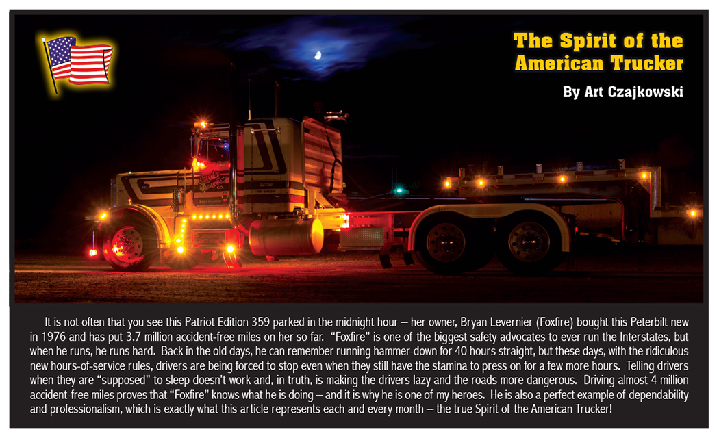 It is not often that you see this Patriot Edition 359 parked in the midnight hour – her owner, Bryan Levernier (Foxfire) bought this Peterbilt new in 1976 and has put 3.7 million accident-free miles on her so far.  “Foxfire” is one of the biggest safety advocates to ever run the Interstates, but when he runs, he runs hard.  Back in the old days, he can remember running hammer-down for 40 hours straight, but these days, with the ridiculous new hours-of-service rules, drivers are being forced to stop even when they still have the stamina to press on for a few more hours.  Telling drivers when they are “supposed” to sleep doesn’t work and, in truth, is making the drivers lazy and the roads more dangerous.  Driving almost 4 million accident-free miles proves that “Foxfire” knows what he is doing – and it is why he is one of my heroes.  He is also a perfect example of dependability and professionalism, which is exactly what this article represents each and every month – the true Spirit of the American Trucker!