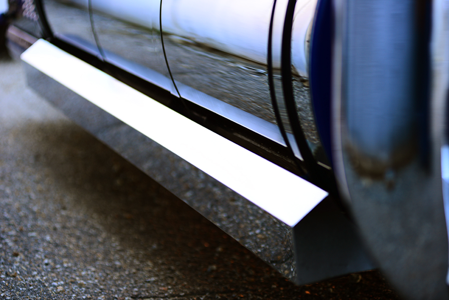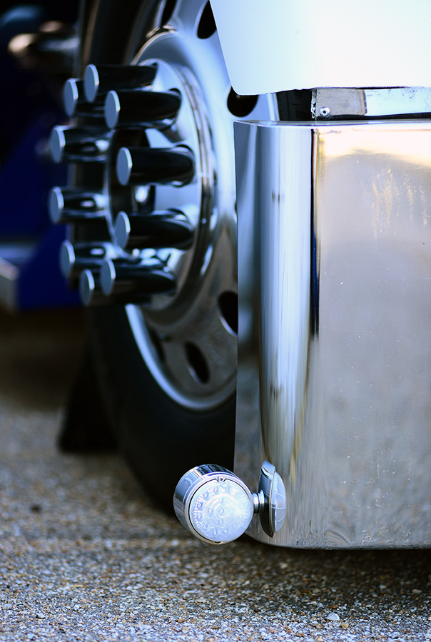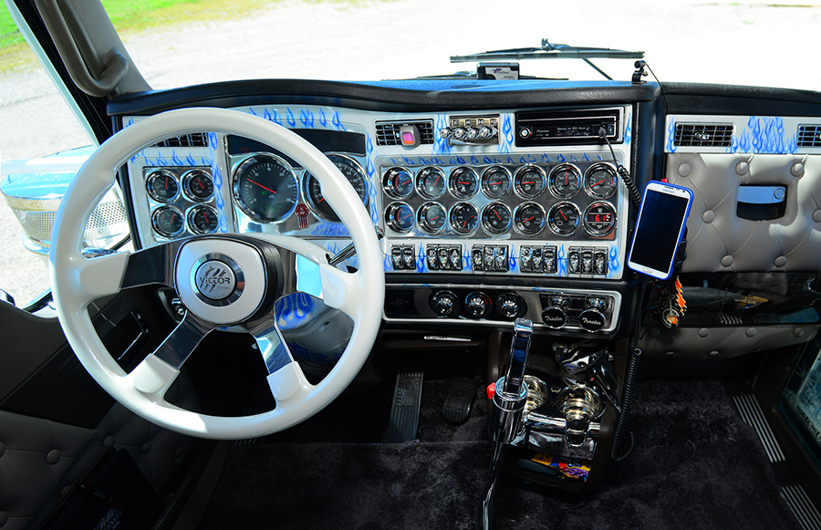 The “cut-down” look of this rig is a true contradiction, because a great deal of work was actually done to this spotless KW. Outfitted with a 12 Gauge visor and mirror brackets, the truck also features a 20-inch blind-mount American Eagle bumper with a 12 Gauge flip kit, pin-striped flames on the driveshaft, chrome-plated aluminum wheels (which have a noticeably-darker shine than polished aluminum rims), and stainless steel wrapped tanks and steps from RoadSknz. With the chrome-plated wheels and stainless wrapped tanks and steps, Chad’s truck looks just as good with less polishing.
