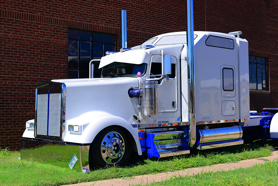 Meeting Chad in Tonkawa, Oklahoma at the Busted Knuckle show, put on by the folks at Wilkins Oklahoma Truck Supply, we cruised into Ponca City for his photo shoot. Searching for just the right locations to shoot his truck, we worked late into the afternoon, waiting for the light (or lack thereof), to be just right (shooting a white truck can be more difficult than you might think). Always keeping focused on trucking, though, as soon as the shoot was done, Chad was hooked back to his step-deck and rolling north to make a delivery. It may look great at the shows, but the truck certainly isn’t yard art.