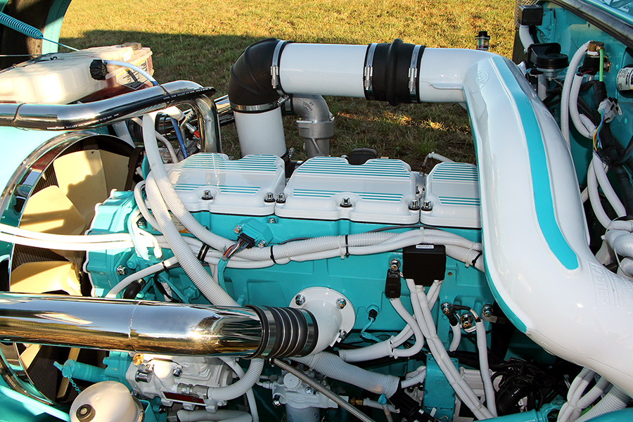 While the truck was still at the dealership getting painted, Jerry’s guys rebuilt the engine. Seeing how good the truck was looking, they decided to paint the engine, too. Using special paint that can handle up to 12,000 degrees of heat, the engine was painted turquoise with white valve covers and accents. Eventually, everything under the hood would be either painted, polished or chromed. They also added a PDI Big Boss turbo and exhaust manifold, as well as a Diesel Freak tune, giving the engine about 730 hp. Once the truck got to Jerry’s shop, his mechanic, Mike, dropped in the motor, along with an 18-speed transmission, and got everything running.