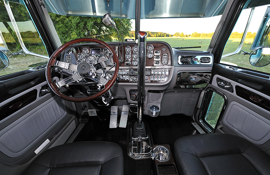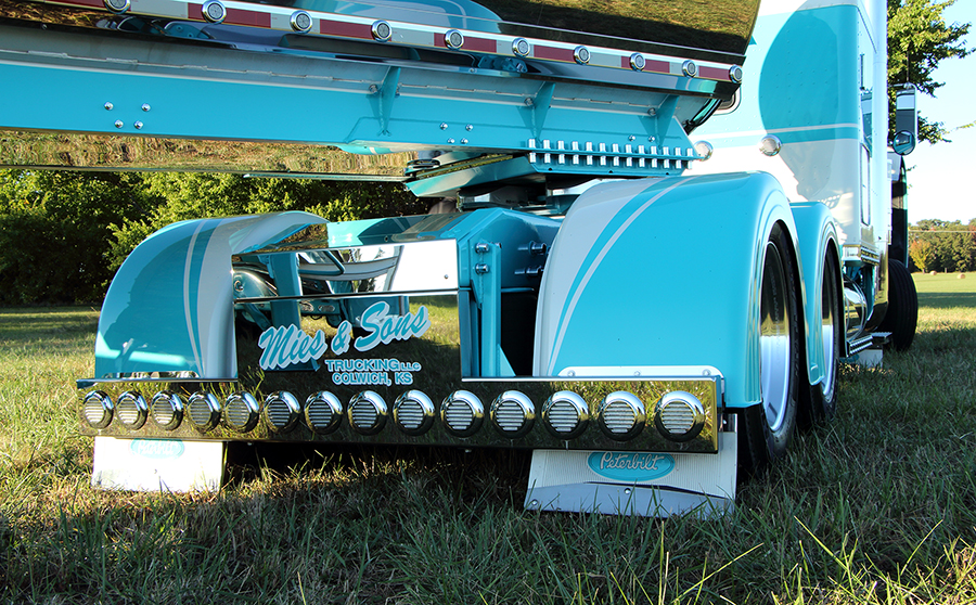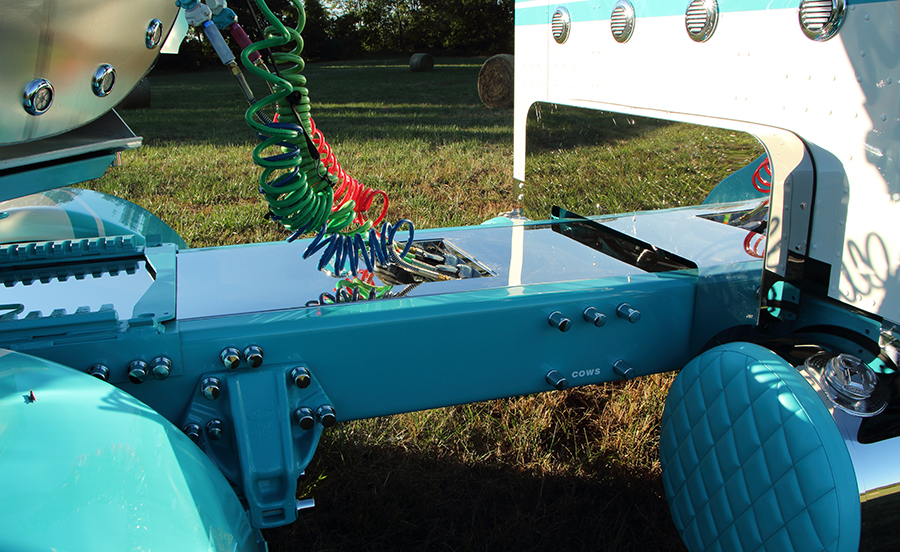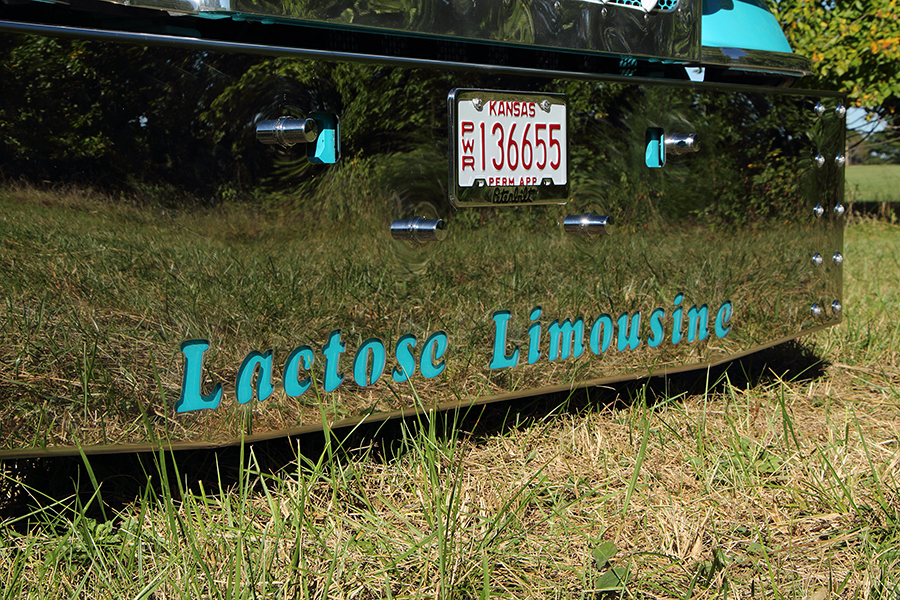 Covered with cool stuff from top to bottom and front to back, the truck features a tapered Valley Chrome bumper with the truck’s name (Lactose Limousine) laser-cut into it and back-lit in blue, J.W. Speaker LED headlights on Double JJ brackets, stainless front and rear visors from RoadWorks and Dynaflex 8-inch exhaust. The grill was powder-coated turquoise and the grill bars were powder-coated white, while the tanks and boxes were wrapped in stainless by Brunner’s in Joplin, MO. The truck came with five cab lights but Jerry added six more, stainless fairings were mounted along the bottom of the fuel tanks, and 5-inch stainless cab and sleeper extensions were installed. Behind the cab, the truck was fitted with a stainless deck plate, a stainless rear light bar, and a custom stainless shox box cover. The final details included the lettering, thanks to Signs by Shire, and etched glass on each side of the cab (every Mies & Sons’ truck has their signature cow head etched into each side window).