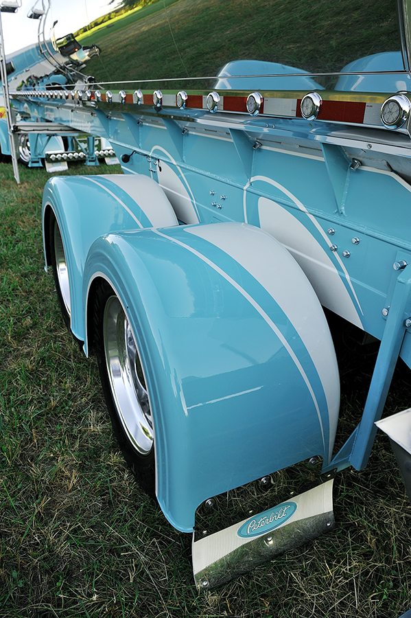Not to be outdone by the truck, Jerry also rebuilt his 2008 Walker stainless milk transport trailer. Featuring a 6,500-gallon capacity, the 45-foot long tanker with polished sides was taken to Peterbilt of Garden City where they painted the frame and mounted matching WTI fenders. A custom rear bumper, laser-cut just like the front bumper and back-lit in blue, was mounted to the rear of the trailer. The back of the trailer is also equipped with a special electric pump and 40-foot hose so that Jerry can pick up or deliver at the smaller farms, too. For the finishing touch, Jerry had Brunner’s Fabrication cover the entire belly of the trailer with stainless steel panels.