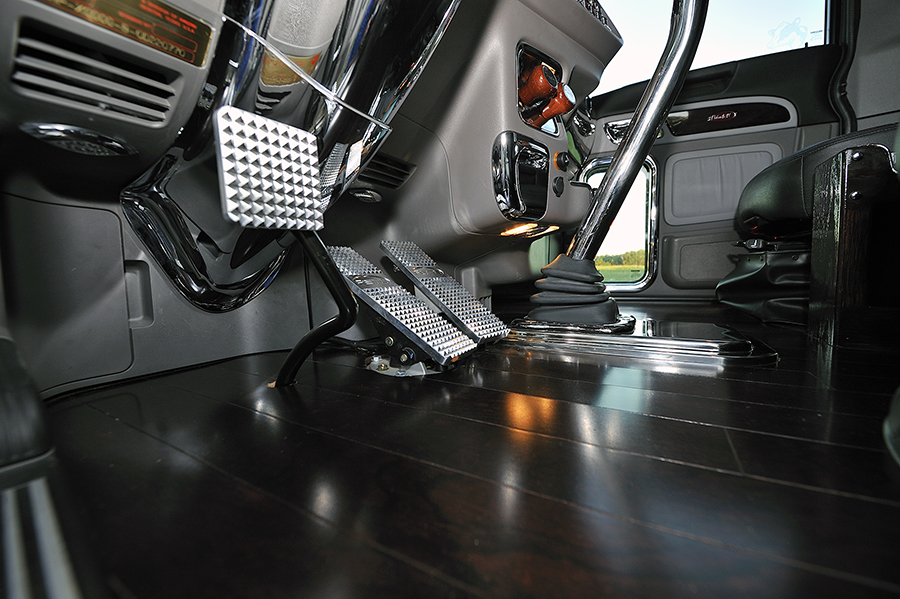 Last but not least is the interior of Jerry’s new rig. While building this Peterbilt, Jerry and Cathy were also remodeling their house. The guy who was doing new wood floors in their house offered to do the truck’s floor, as well. Using dark-stained hardwood strips from Home Depot, the guy installed an elegant floor in the cab and sleeper. In addition to the black leather Sears seats and every conceivable dash accessory, the cab also has a “gangster” shifter from 4 State Trucks, a wood steering wheel, stainless foot pedals and a chrome CB. Back in the sleeper they mounted a flat-screen TV, but other than that, it is still pretty stock back there.