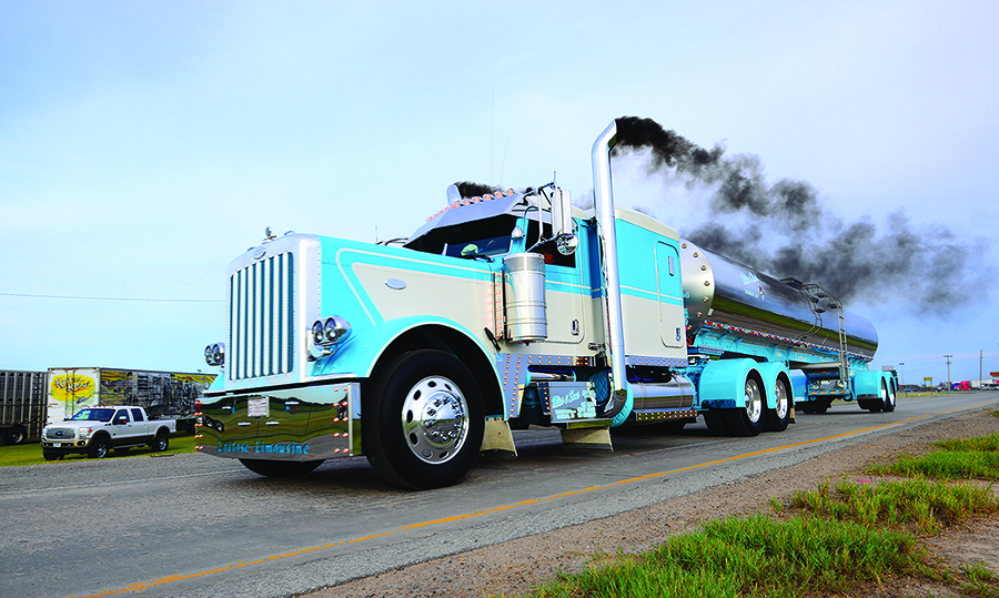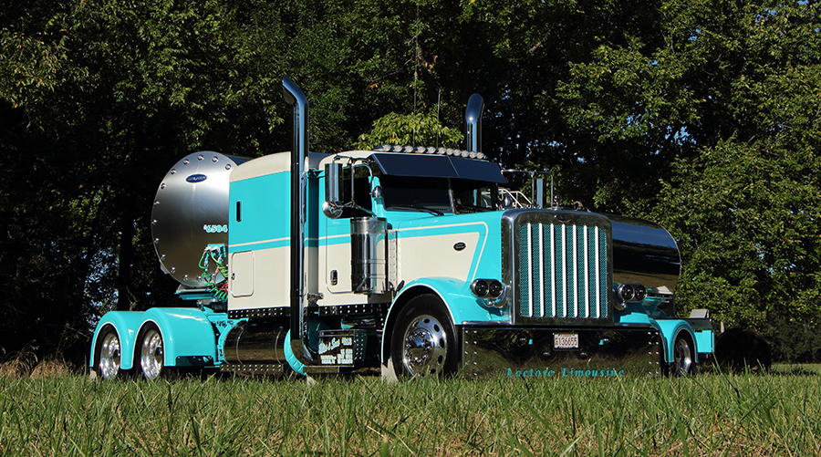 In 2001, wanting to have a truck to “play” with, Jerry bought a 1968 needle-nose Pete and then spent the next three years restoring it. Painted pearl white with black cherry fenders, Jerry had fun taking this truck to local shows and events. Although Jerry sold it in 2007, the truck is still out there, and the new owner still takes it to some of the antique shows. After selling the needle-nose, Jerry bought himself a new 2007 Peterbilt 379 and fixed it up similar to the one you see here – it was painted turquoise and white, had a 265-inch wheelbase and was equipped with a 550 Cat. Jerry called this truck the “Calcium Cadillac” (he likes to give his trucks funny names). It was a really nice ride, but nowhere near as fancy or custom as his latest personal rig.