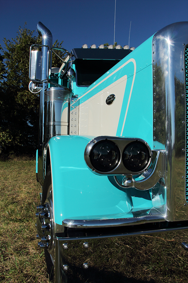 After driving that 2007 Pete for several years, he passed it down to one of his boys to drive and ordered himself another new truck. Wanting this one to be really special, and one only he would drive, Jerry went all-out. They had a 2004 model C-15 Cat 6NZ engine just sitting around, so the 2013 Peterbilt 389 was ordered as a glider kit. Featuring solid turquoise paint, 3.36 rears, a 272-inch wheelbase and a fully-loaded interior, the truck was delivered to Peterbilt of Garden City in January of 2013. Once there, the dealership added the pearl white stripes (which were designed by Jerry) to the truck, and then also painted and mounted a set of matching WTI double hump fiberglass fenders.