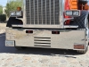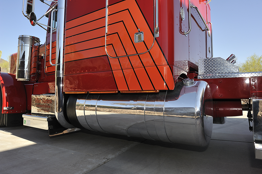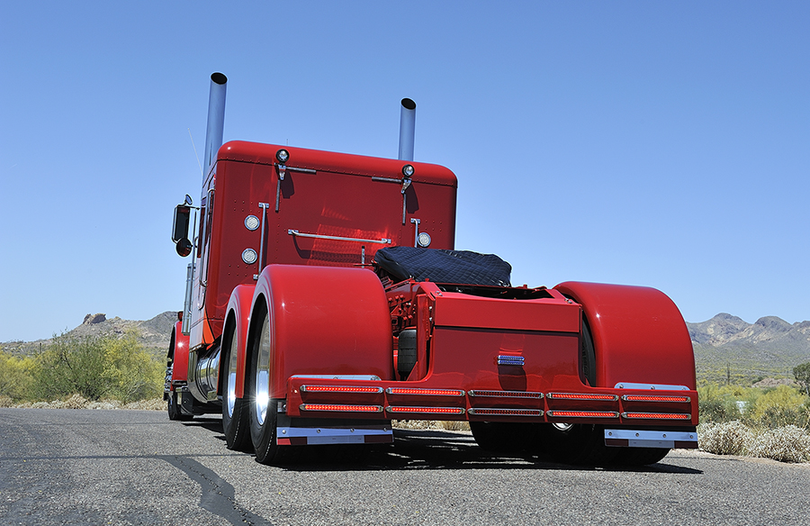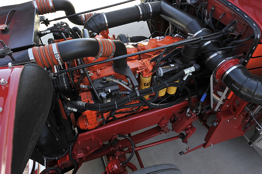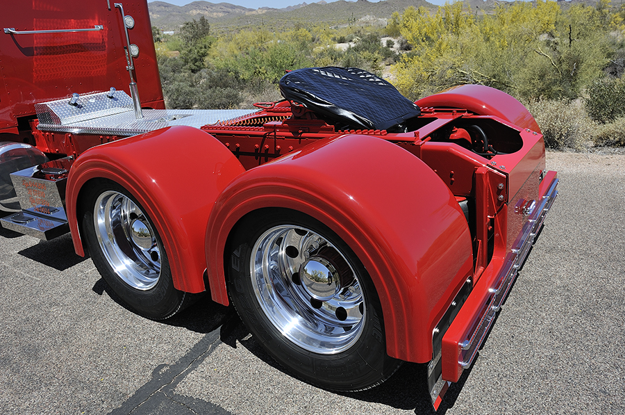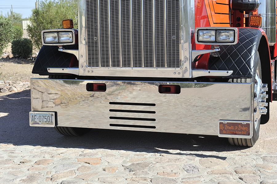 In 2011, Theresa decided that it was time to update the 359s drivetrain. The original Cat 3406B was still in it and still running strong, but it had close to two million miles on it. Wanting to upgrade a bit, she had Tri-State Diesel in Enfield, CT pull the motor and replace it with a Cat 3406C with air-to-air (she sold the original motor to a guy who is still running it today). Tri-State also upgraded the transmission to an 18-speed and switched out the original rear ends with 3:73s. With the new engine came a smaller condenser, so the air conditioning system had a hard time cooling off that old cab and sleeper. To remedy the problem, Dean and Theresa added a second condenser behind the front bumper, and then had Valley Chrome fabricate her a new bumper with four slits in it to allow air to flow to the condenser. It all worked out perfectly and, once again, Theresa could cruise across the hot desert in a cool and comfortable cab.
