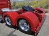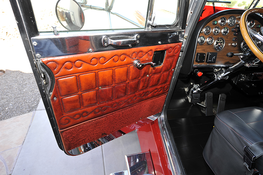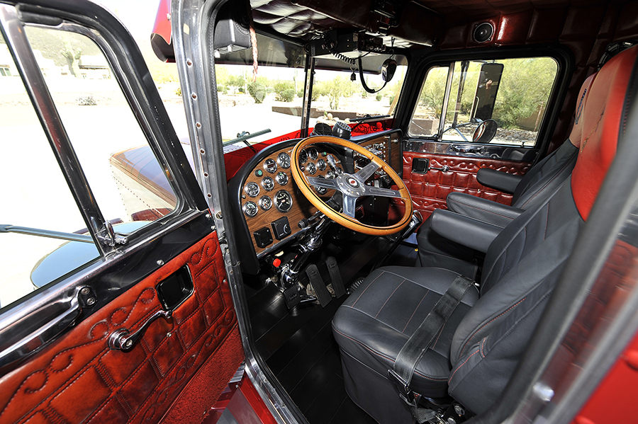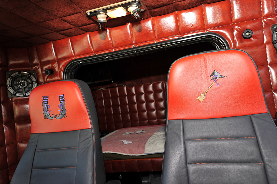 Earlier this year, Theresa decided to take her truck to the big show in Louisville, Kentucky. In preparation for that show, she did a little more work to her truck, which included installing WTI single-hump fiberglass fenders and Talladega County Fiberglass cab and sleeper extensions with LED strip lights. She also added picket elbows to her exhaust, upgraded all of her lights to LEDs, and covered her stainless visor with matching red vinyl (she didn’t want to paint it). She also did a little work inside, although most of the interior is still stock and original. After insulating the entire interior with HushMat panels, Theresa and Dean, with help from their neighbor Jim Bainter, installed a custom black bamboo wood floor in the cab and sleeper. Theresa also had the original seats reupholstered and had “witchy” images (boots on one and a broom on the other) embroidered into the headrests. In recognition of her efforts, Theresa took home the coveted (and beautiful) Best of Show trophy in the Working Bobtail class at MATS in Louisville last March. Not bad for a 30-year-old truck with 2.5 million miles on it!