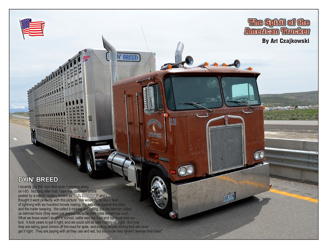 I recently got this cool shot of “DYIN’ BREED” while humming along on I-80. Not long after that, I saw this comment online posted by a retired cowboy known as C.D. Beverage and I thought it went perfectly with this picture: “We would fly by like a flash of lightning with six hundred horses roaring, the two stick against the dash, and the trailer swaying. We called it rocking and rolling, but the lawman called us damned fools (they were just jealous because their rides weren’t as cool). What we knew wasn’t taught in school, cattle was our load and our truck was our tool. It took years to get it right, and we could still be safe roaring all night. But now they are taking good drivers off the road for spite, and putting people driving that will never get it right. They are paying with all they use and eat, but you know they haven’t learned their beat!”