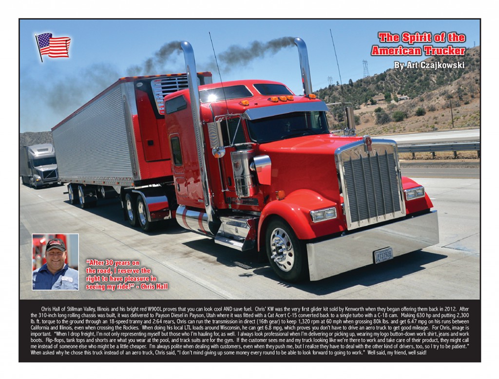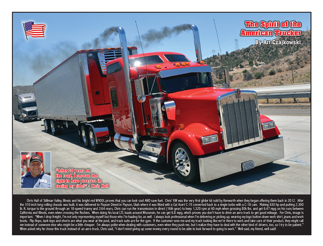 Chris Hall of Stillman Valley, Illinois and his bright red W900L proves that you can look cool AND save fuel. Chris’ KW was the very first glider kit sold by Kenworth when they began offering them back in 2012. After the 310-inch long rolling chassis was built, it was delivered to Payson Diesel in Payson, Utah where it was fitted with a Cat Acert C-15 converted back to a single turbo with a C-18 cam. Making 630 hp and putting 2,300 lb. ft. torque to the ground through an 18-speed tranny and 2:64 rears, Chris can run the transmission in direct (16th gear) to keep 1,320 rpm at 60 mph when grossing 80k lbs. and get 6.47 mpg on his runs between California and Illinois, even when crossing the Rockies. When doing his local LTL loads around Wisconsin, he can get 6.8 mpg, which proves you don’t have to drive an aero truck to get good mileage. For Chris, image is important. “When I drop freight, I’m not only representing myself but those who I’m hauling for, as well. I always look professional when I’m delivering or picking up, wearing my logo button-down work shirt, jeans and work boots. Flip-flops, tank tops and shorts are what you wear at the pool, and track suits are for the gym. If the customer sees me and my truck looking like we’re there to work and take