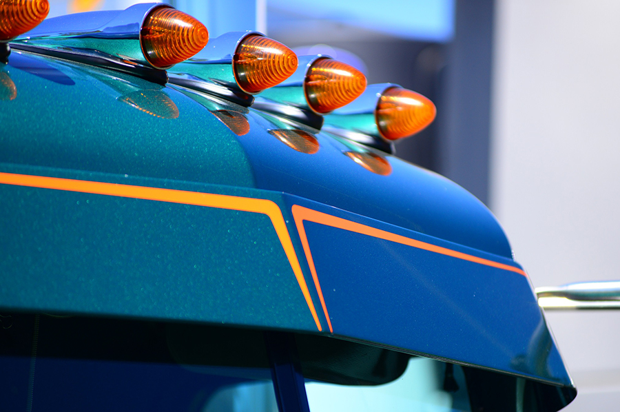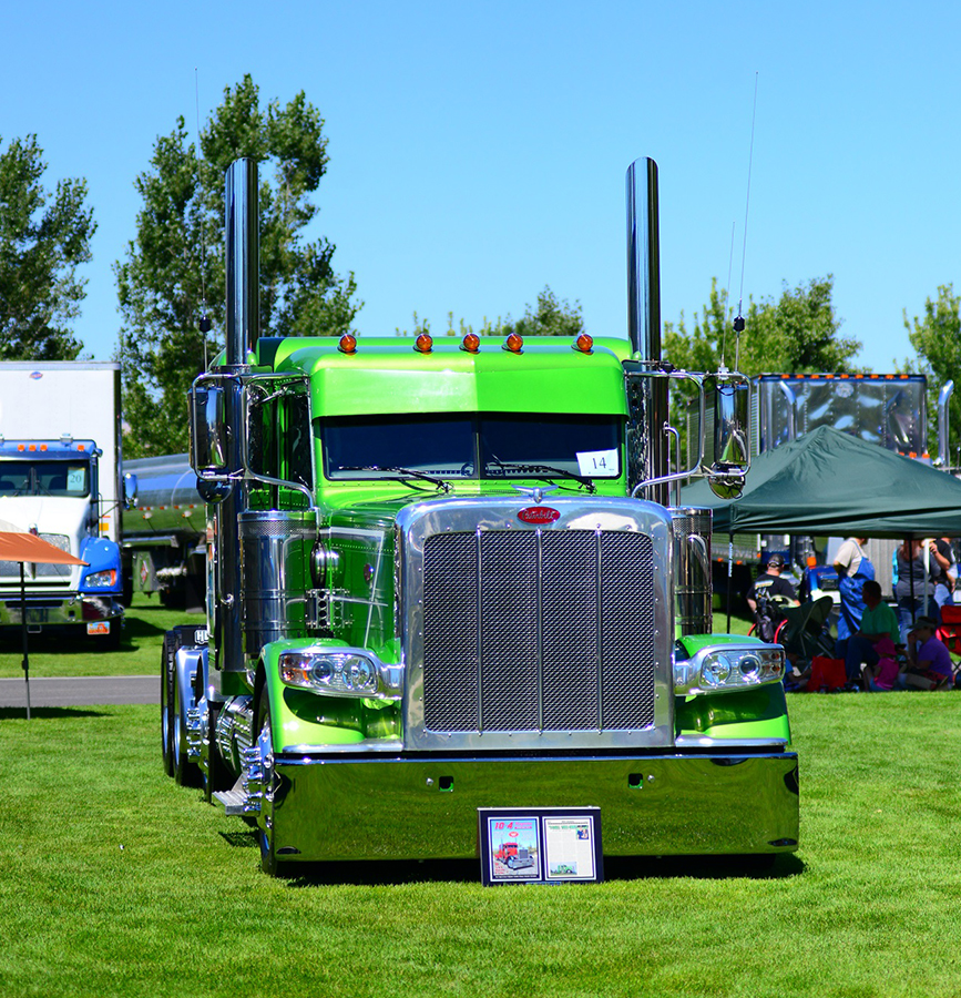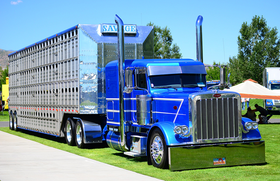 Some of the new faces at the show this year included the crew from Tim Savage Trucking. Cattle haulers from Herriman, UT, Tim and Sherry Savage, along with their driver Jeff Hansen, had their two sweet 389s at the show. Respectively painted metallic blue and metallic green, each accented with silver and white striping, the two trucks both showed well for the livestock-hauling community. Jade was also in attendance with one of their spotless Peterbilts – and they did a good job of representing Canada’s finest.
