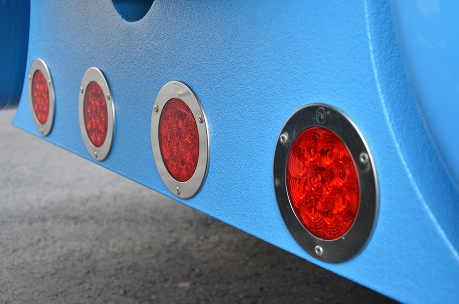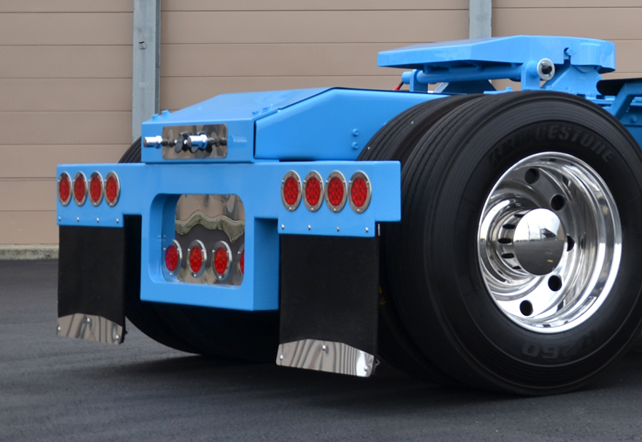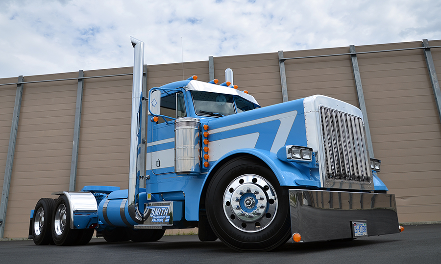 When it came time for the new paint, Brandon was inspired by the original blue with white striping that his old Freightliner cabover had worn, so he decided to go with that scheme again. The paint was done by Andy Cliffton of Central Heavy Duty Paint and Body in Benson, NC. Since falling debris can be hard on the rear of a truck doing dump trailer work, Brandon took the truck to Line-X in Raleigh, NC to have their protective coating put on the rear fenders, deck plate and rear light bars. After the work was completed at Line-X, it was taken back to Andy to have matching blue paint blended with the Line-X so the truck could keep its simple, clean look.