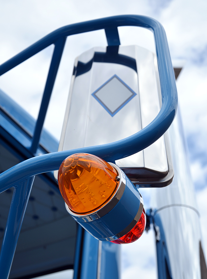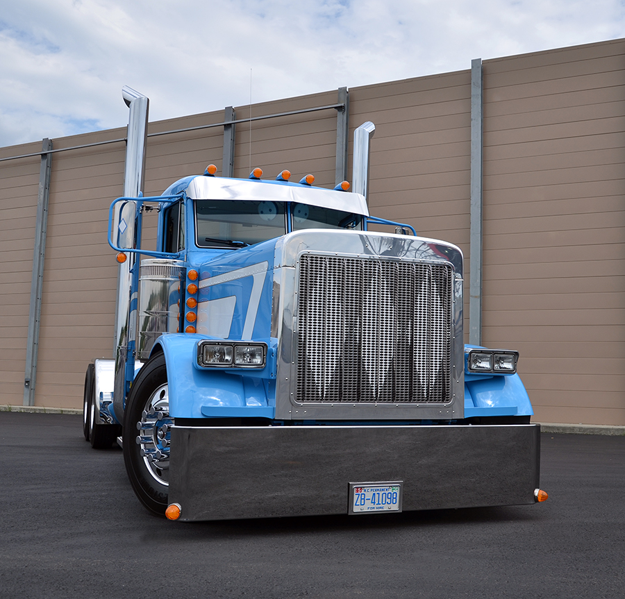 Before the ‘96 Pete began working, it was sent to Ohio for a full makeover, including a new blue and white paint job. In 2011, the truck suffered a frame break, so since they had to replace the rails anyway, Brandon decided to go ahead and stretch the 210-inch wheelbase to 234 inches. Then, in June of 2013, the decision was made to do a full rebuild of the truck. Everything was sandblasted down to bare aluminum, the chassis was painted inside and out, and new 3:55 rear-ends were installed. Wanting to give the truck an old-school vibe, a custom two-piece windshield was also made and then fitted onto the truck.