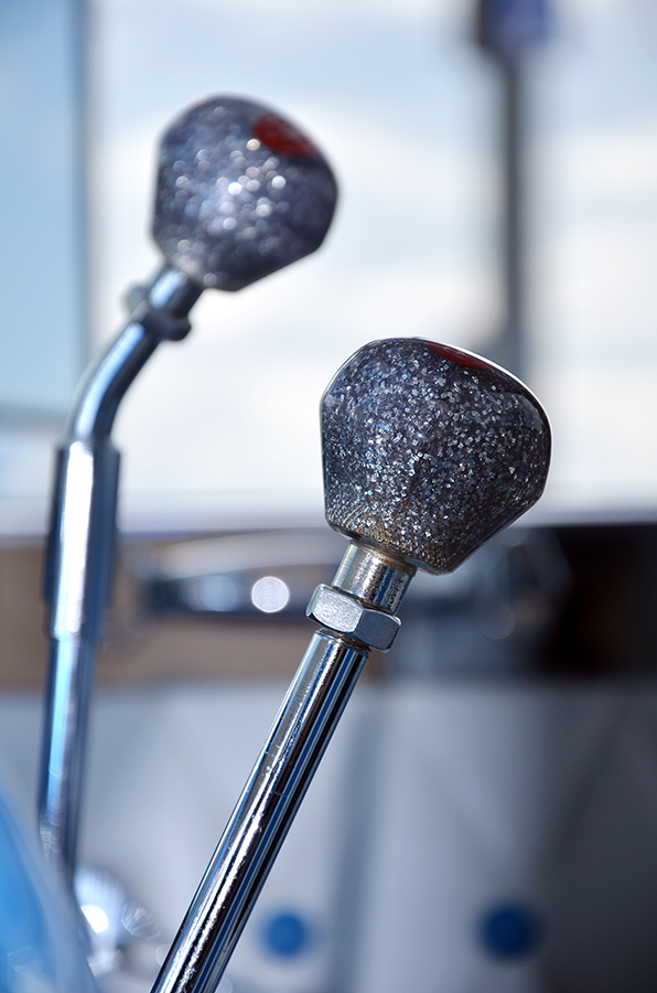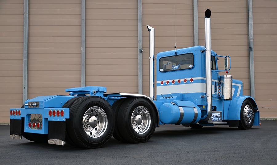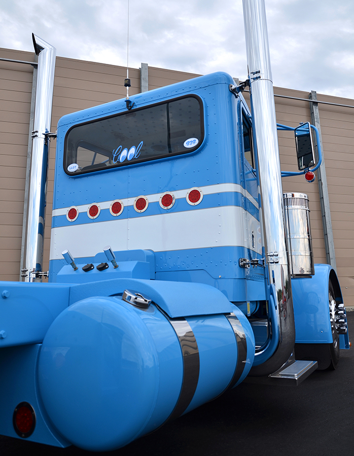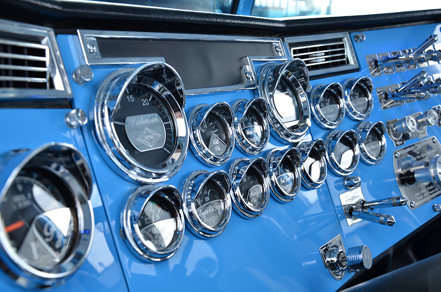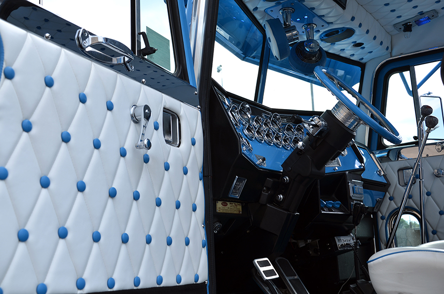 For the interior, things were kept just as clean as the exterior, but with a cool old-school twist – a Kenworth-style white and blue button-tuck upholstery graces the ceiling and door panels, and twin sticks, hooked up to the 13-speed transmission, were topped-off with Peterbilt glitter knobs. Rockwood built dash panels that were set and painted to match the exterior, two chrome dash fans were hung overhead to give the rig a more 359 vibe, and a jammin’ Alpine stereo system was installed.