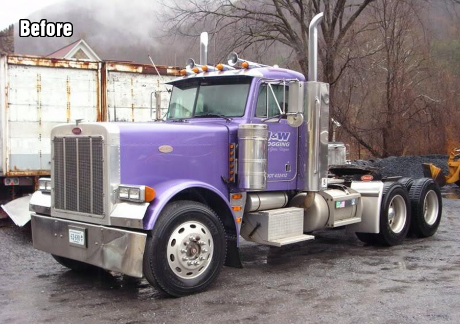 Over the next five years, Brandon hauled crushed recycled glass around North Carolina. In 2004, Brandon purchased a light blue and white ‘78 Freightliner FLB cabover with a 300-inch wheelbase from Randy Kerns, along with a dry van, for a different taste of trucking. After doing over-the-road work for over four years, he went back to hauling recycled crushed glass locally. Still running the cabover, after a month of doing short-haul dump trailer work, constantly jumping in and out of the cab and trying to get around with no power steering, Brandon was ready to make a change. Selling the cabover to 10-4’s own Trevor Hardwick (our Poetry in Motion author from Washington), Brandon bought a purple 1996 Peterbilt 379 daycab with a 3406 Caterpillar, out of Virginia, to be a more practical everyday work truck. That plain truck would eventually become the beauty you see here on these pages now.