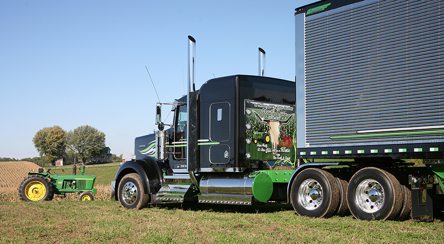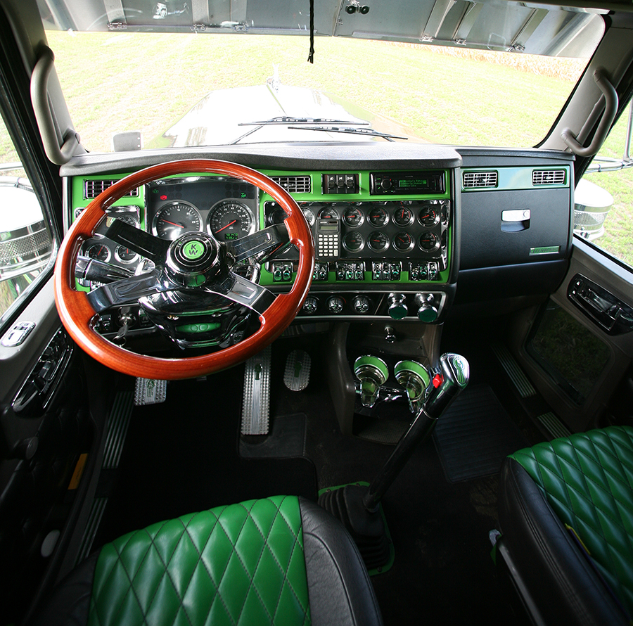 The KW is powered by a 565 ISX Cummins with a 13-speed and 3.73 rears, and everything rolls on 22.5 low-pro Bridgestones. With the help of Brandon and Scott at Crossroads Trailer in Albert Lea, MN, the new trailer got in on-time and went directly to Winona Diesel to have the rails painted Sable Black to match the truck – then it was on to Roadsknz for some stainless work (they also wrapped the tanks and skinned the boxes on the truck). Jerry would like to thank Charlie Gotzian at Catalyst Graphics in Big Lake, MN for getting the decals exactly John Deere green.