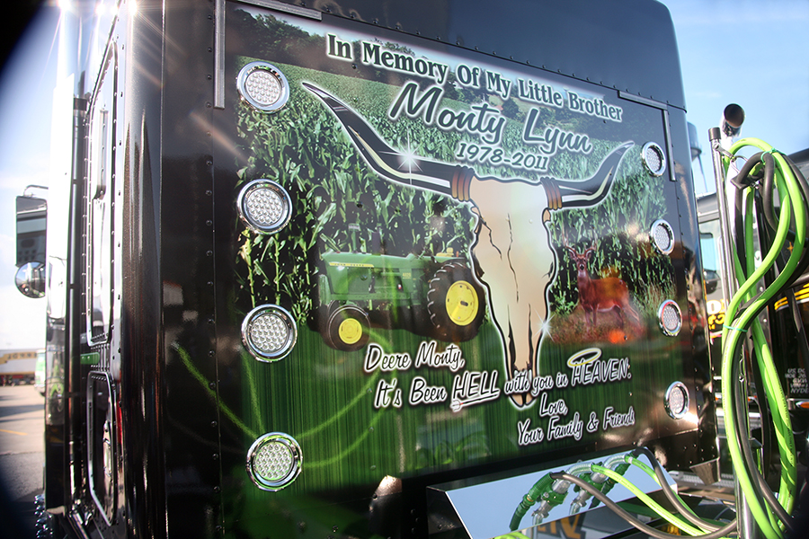 Every trucker has lots of stories to tell, and the more years they have been on the road, the more stories they have. But, if their trucks could talk, I’m sure they would have a few stories to tell, as well. When I first saw Jerry Linander’s 2007 Kenworth W900L and 2014 Great Dane spread-axle trailer at the Walcott Truckers Jamboree, I knew that truck was telling a story of someone very dear who had been lost. Jerry told me, “It’s not a pity party.” No, it is not a pity party, it’s a tastefully put together truck and trailer to remember his brother Monty Lynn, who passed away suddenly from a heart attack at only 32 years of age.