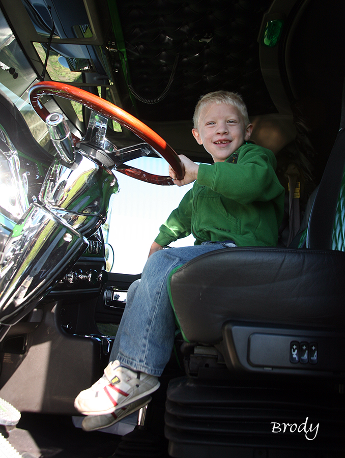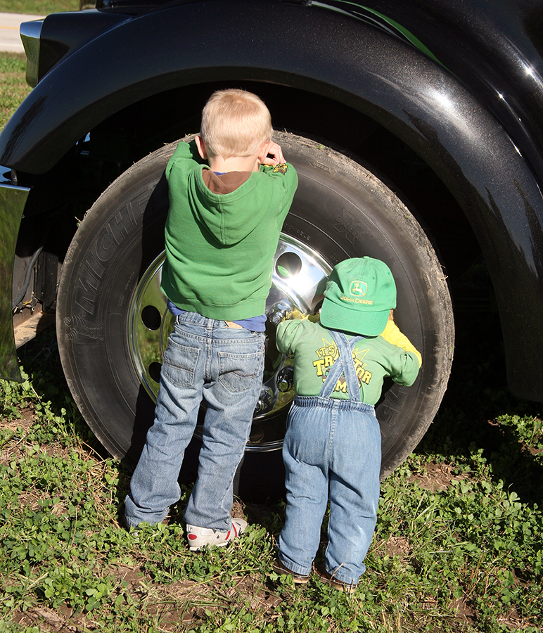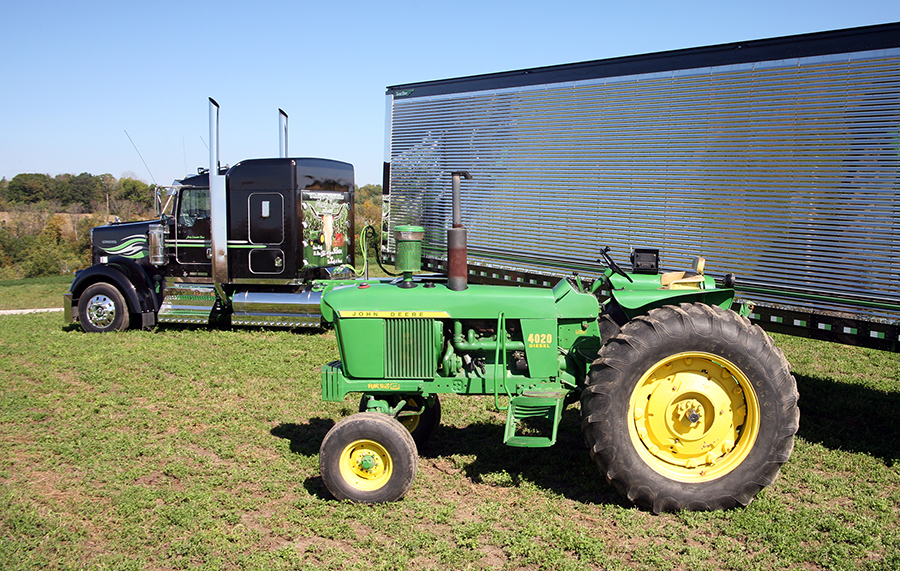 I would like to personally thank Jerry, he and Monty’s father Lynn, Monty’s little boy Brody, and his widow Kate for letting me be the first one to shoot the 4020 and the truck it inspired together. It was a beautiful October day with a perfect set-up that included the shining truck and trailer, the tractor, a freshly-cut hay field, brown corn stocks, blue skies and a little boy running around and sitting in the driver’s seat, atop Uncle Jerry’s shoulders, and in grandpa’s lap on the tractor. Little Brody also liked to pet the chrome donkey that sits on the top of Jerry’s hood – he was just nine months old when he lost his father.