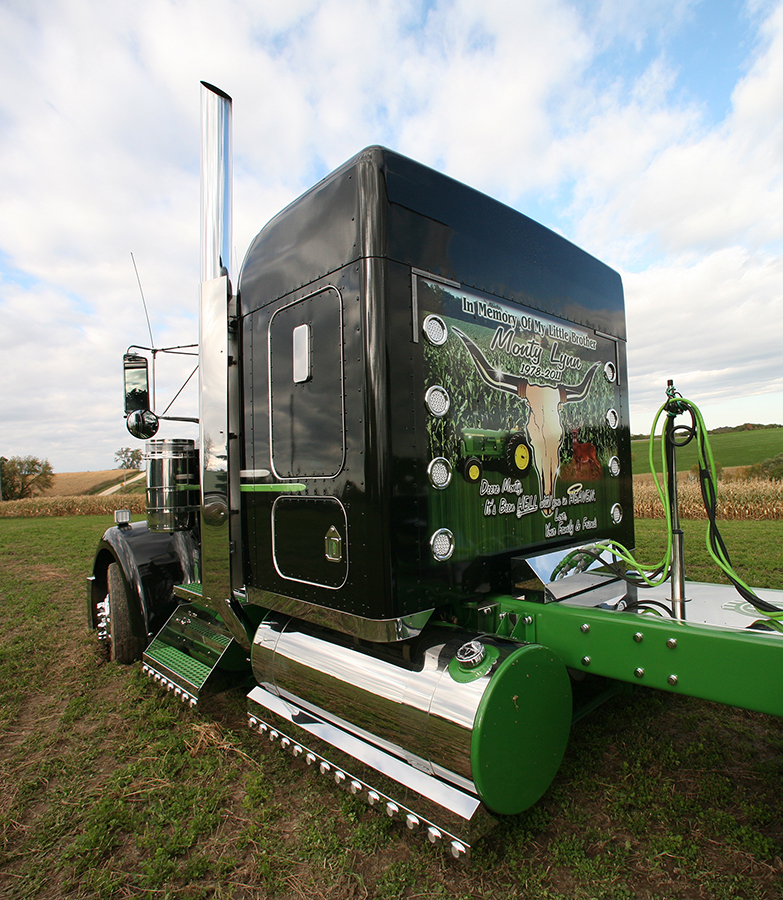 Later that year, Jerry decided that he wanted to put together a special truck to remember his younger brother. In December of 2011, Jerry got a call from his cousin Troy, who has worked for and with Jerry for 12 years, saying that he had found a truck meeting Jerry’s strict criteria – a black Kenworth W900L with a pre-emissions Cummins engine – in Michigan. Jerry, along with Troy and his son Corbin, went to Michigan, bought the truck, and then brought it home to Minnesota to begin its transformation from “just a truck” to Le Roy.