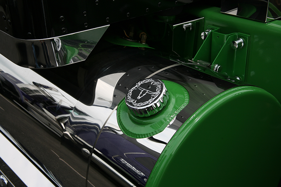 During the build, Jerry’s attention to detail was amazing – everything on this truck is there for a reason. Monty had a donkey named Le Roy, and the donkey hood ornament is there for that reason. This is also why the truck was named Le Roy. The John Deere green frame rails have taken some getting used to for Jerry, but like all of the green on this truck, as well as the “4020” painted on the side, it all represents something that was important to Monty. Even Junior, the pouty baby that Jerry puts against the truck at shows and carries with him in the truck all of the time, is made with a pair of bibs and shoes that were actually Monty’s when he was a little boy.