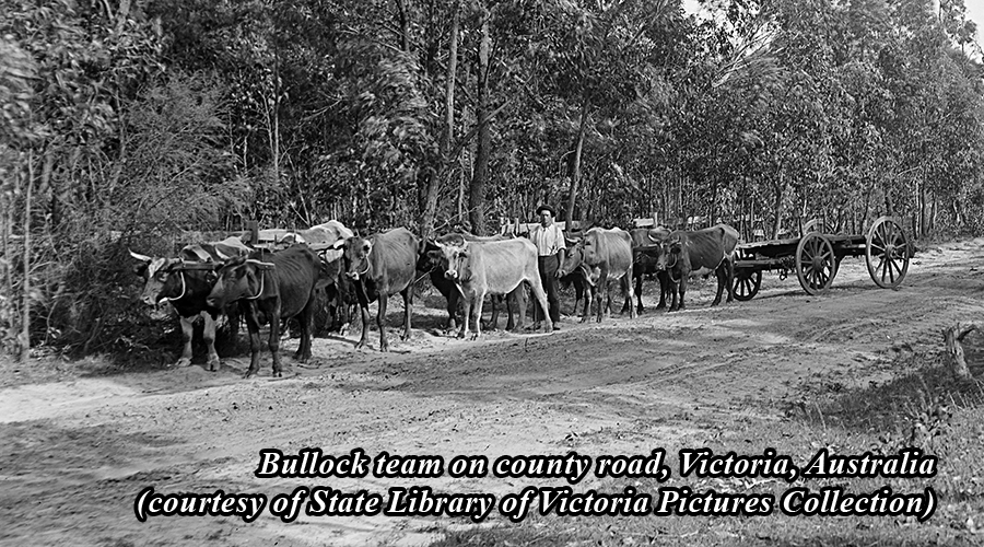 JanTechTips2Agnes decided to start a carting (delivery) business. Back then, deliveries were made by teams of oxen pulling a wagon called a bullock train – there were no trucks, yet. It was 20 years later when a man named J.J. O’Connor walked, wet and cold, into a pub at Toongabbie, a small town in southeastern Victoria on the way to the gold fields, after driving cattle all day. “I saw a boiling kettle on the fire, and thought a hot whiskey would be fine,” he said. “Just then, in walked this great big, rough-looking woman and the landlord introduced me.” It was Agnes, and she was wet and cold, too. “Being the only guests, we sat all evening by the fire. She didn’t boast of anything she had done beyond rearing her children. I asked why she took up bullock-driving, and she said she had to keep her family, and as men were making good money at the carrying trade, she thought she could do the same.” And she did.