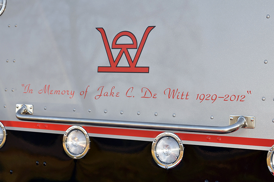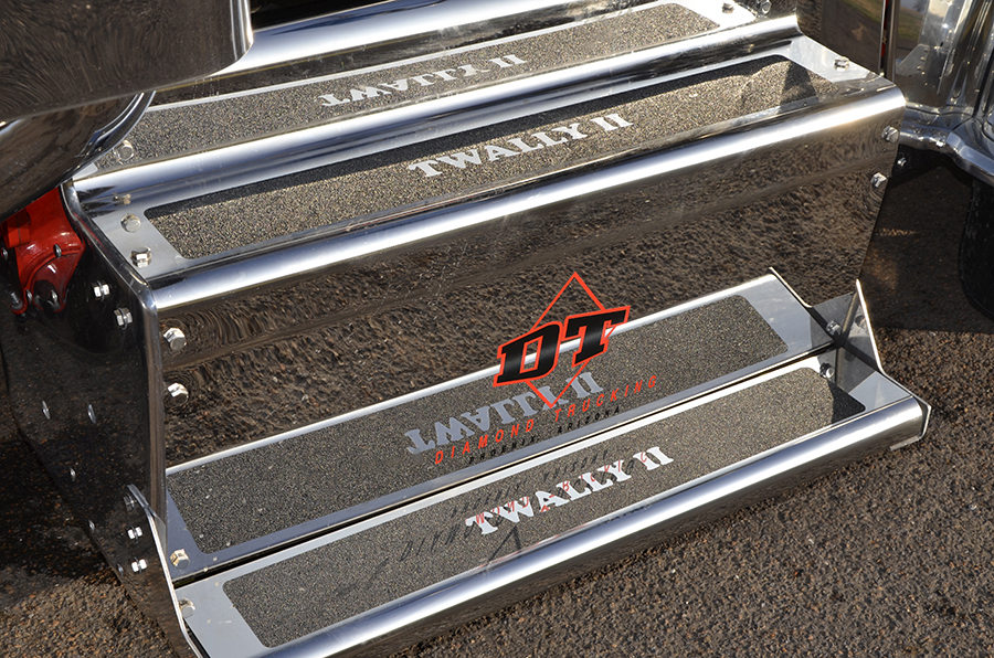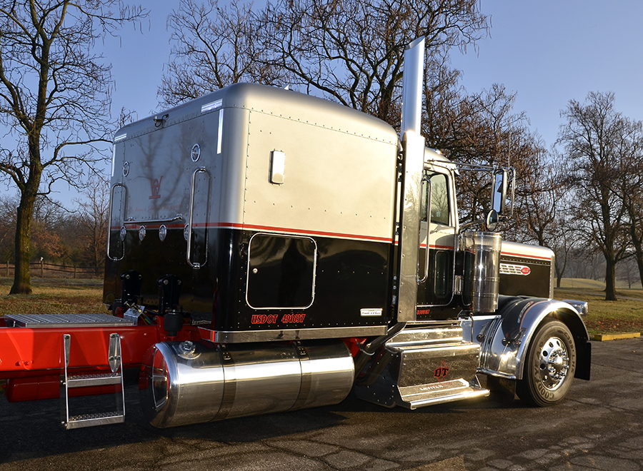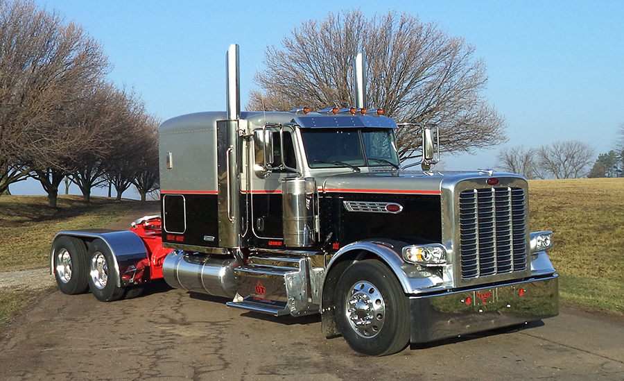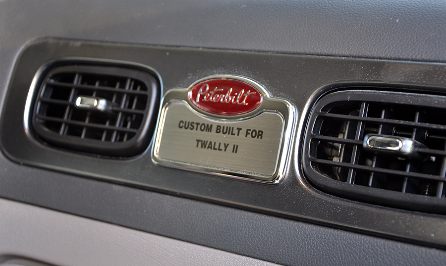 When Bill called Clint, he told him that he wanted to build a truck in honor of his dad, who had passed away in 2012. After talking a bit, he decided to order a new 2016 limited edition Peterbilt 389. This “Pride & Class” Peterbilt is a factory-built truck with a signature louvered grill, polished front fenders, special air intakes on the sides of the hood, extra factory stainless trim, Hogebuilt 1/4 fenders, special mud-flaps and badges, an upgraded interior with dark gray trim and red stitching on the seats, and a custom 4-spoke leather steering wheel.